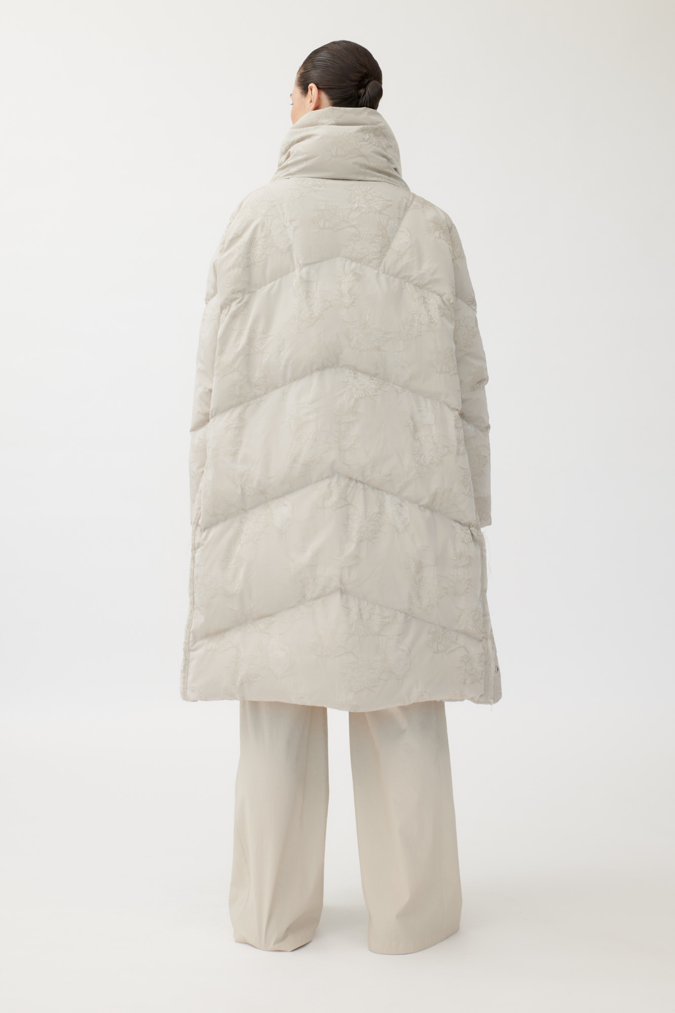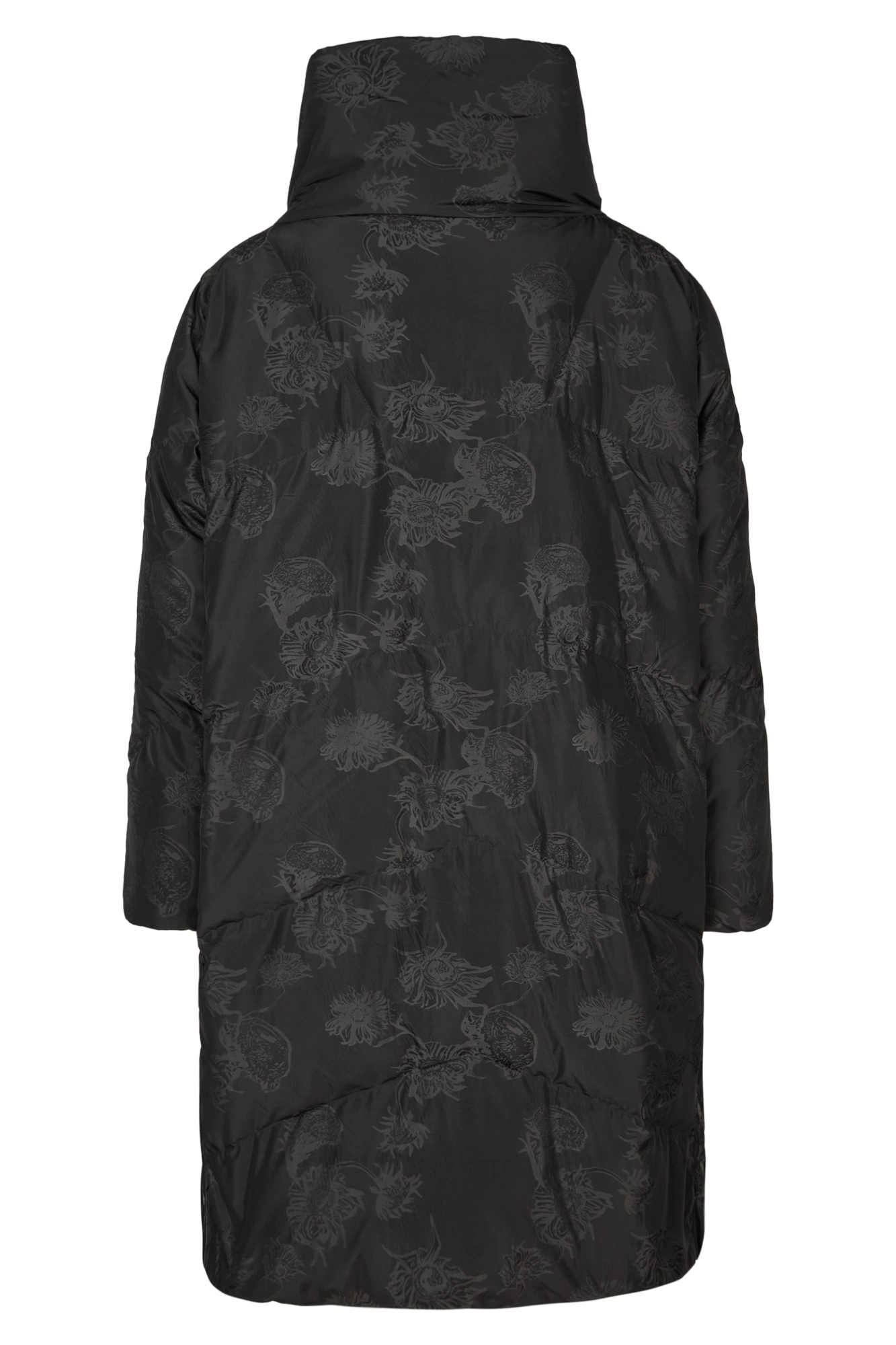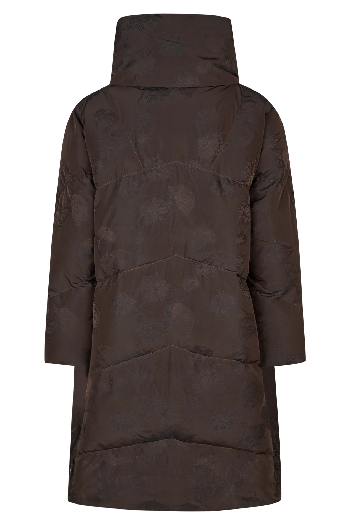 Leichter, voluminöser Daunenmantel aus floralem Jacquard.