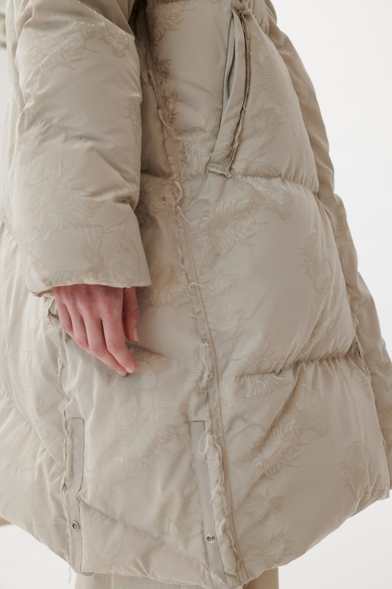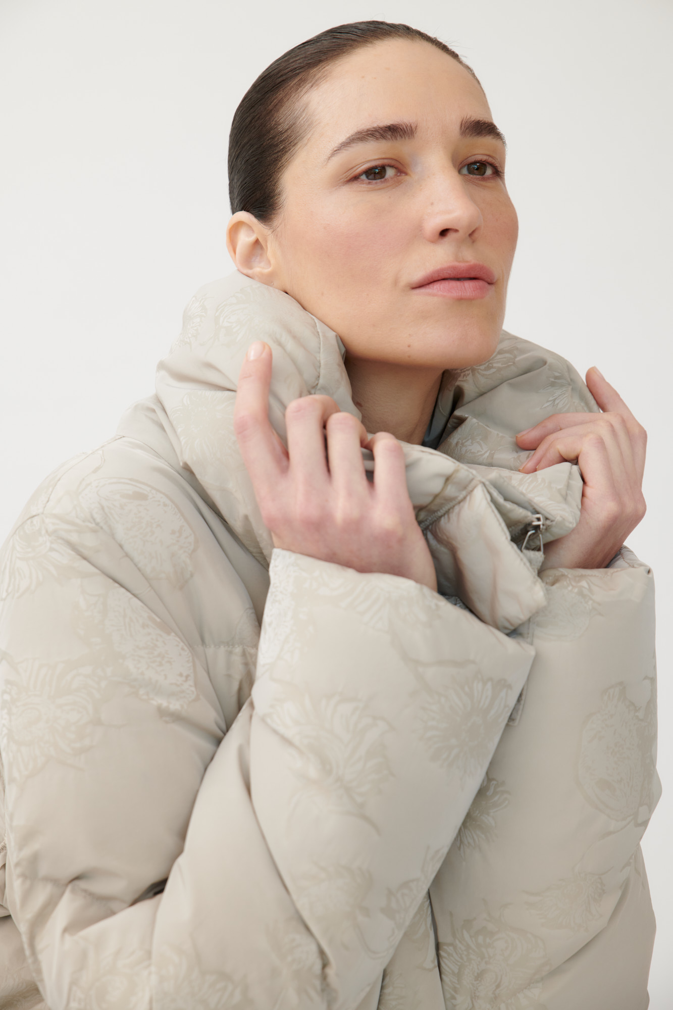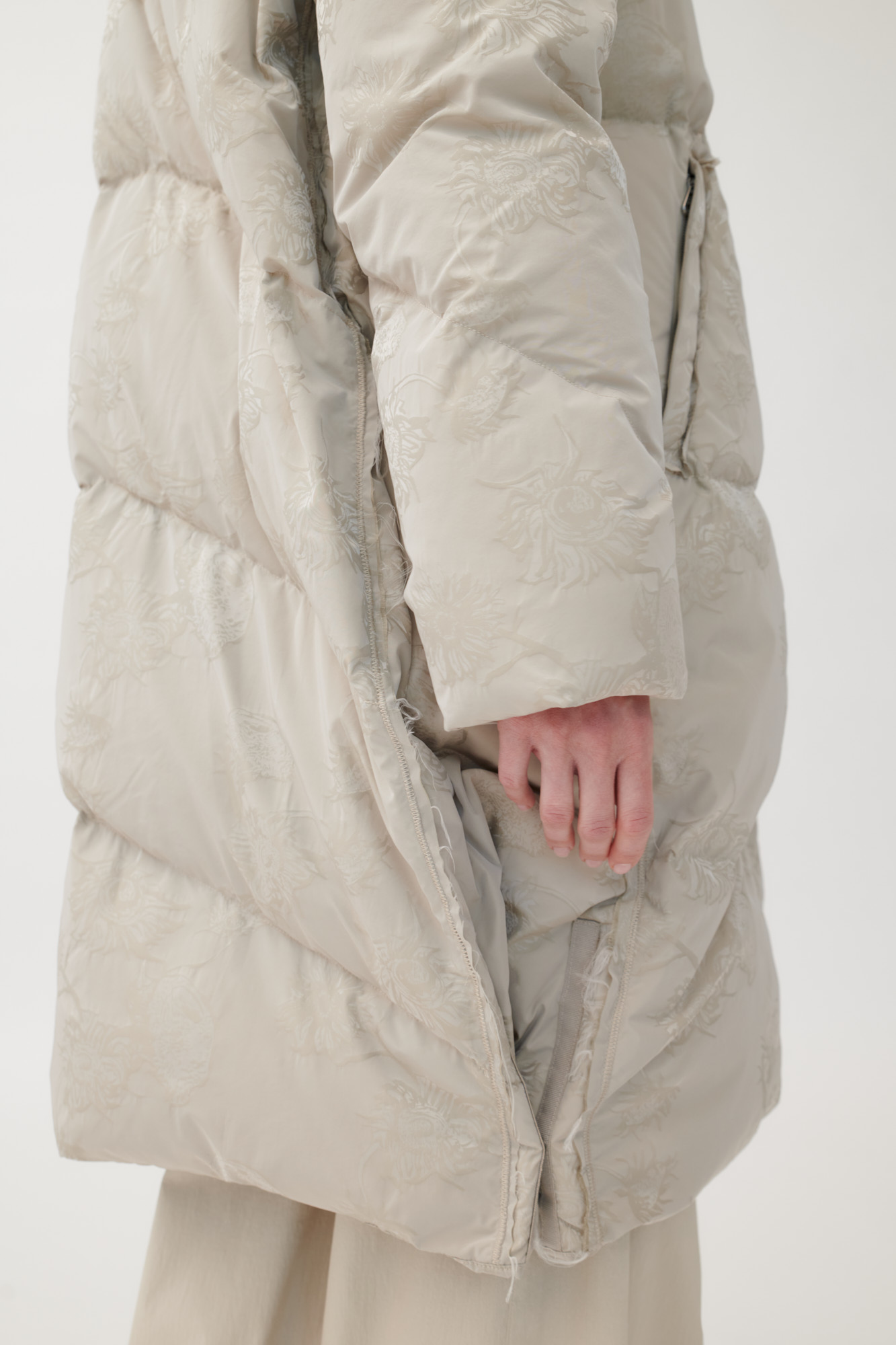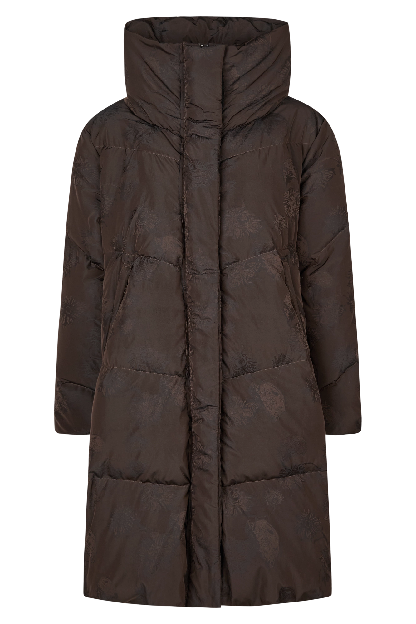 Leichter, voluminöser Daunenmantel aus floralem Jacquard.