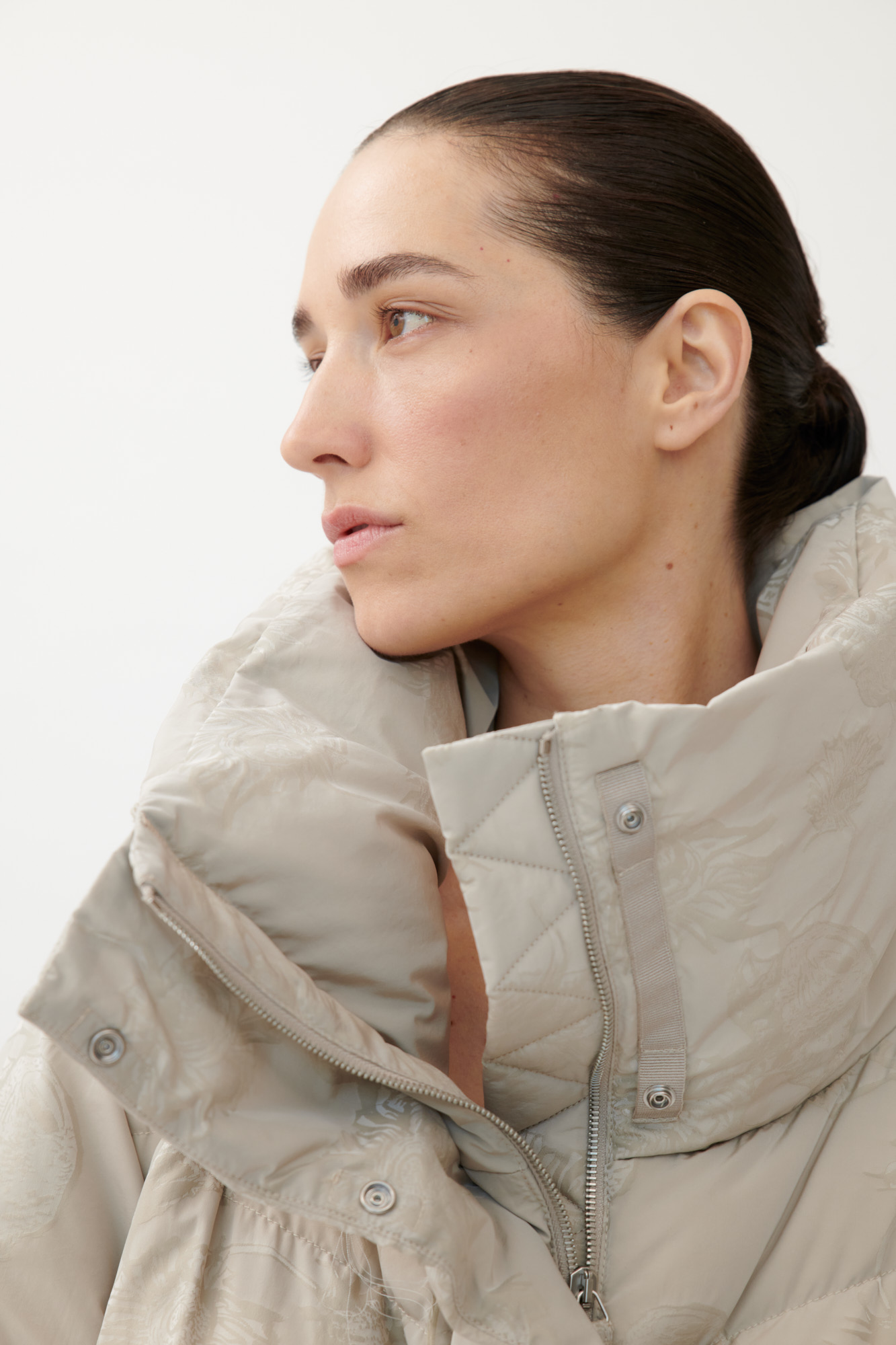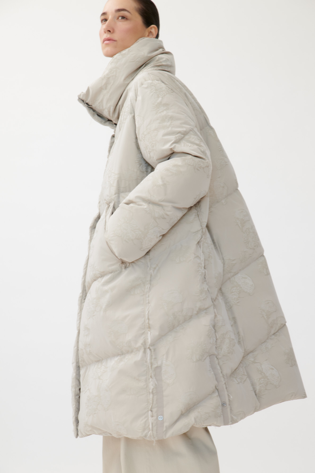 Leichter, voluminöser Daunenmantel aus floralem Jacquard. • Großzügiger Stehkragen • Seitliche... mehr