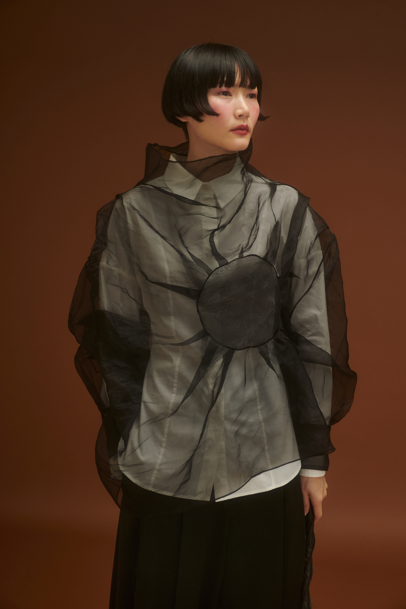 Avantgardistisches Seidentop mit applizierter Sonnenblume.