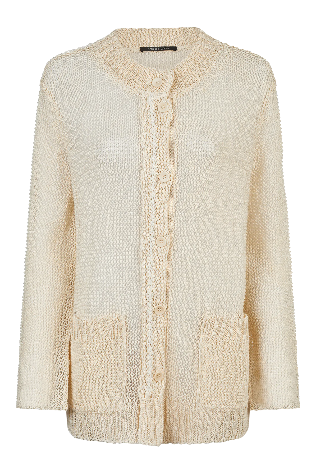 Unsere locker gestrickte Strickjacke überzeugt mit Transparenz und entspannter Weite. Aufgesetzte Beuteltaschen und Rippenabschlüsse an Arm und Halsausschnitt sorgen für Struktur. Ein farblich abgesetzter Akzentfaden entlang der Knopfleiste verleiht dem Modell einen dezenten Twist.