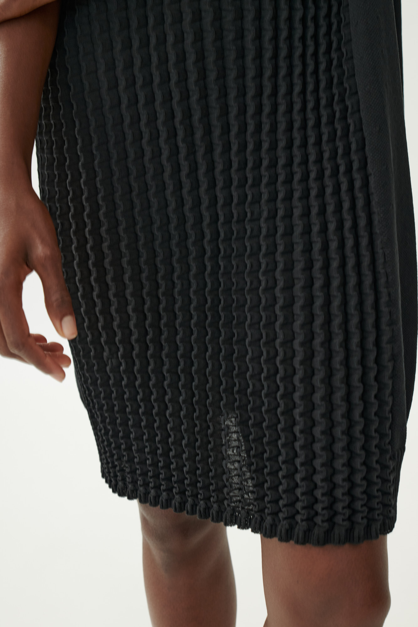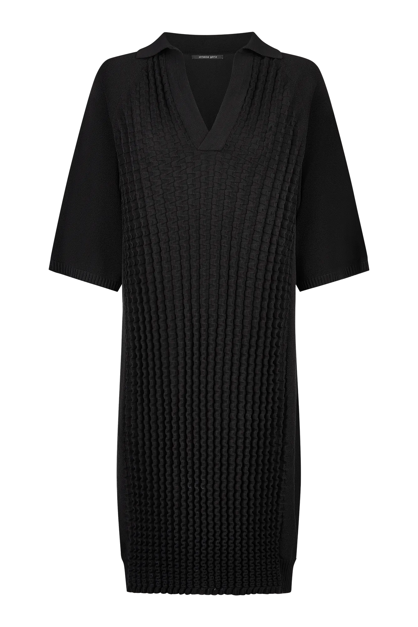 Körpernah gestricktes Kleid aus reiner Baumwolle mit moderner Strukturkombination. Der dreidimensionale Strick im Vorderteil trifft auf sportlichen Piqué-Strick und verleiht dem Design Tiefe. Raglanärmel in halber Länge und ein gestrickter Polokragen runden den Look ab. Dank der Seamless-Technologie entsteht weniger Verschnitt – für eine ressourcenschonende Fertigung.