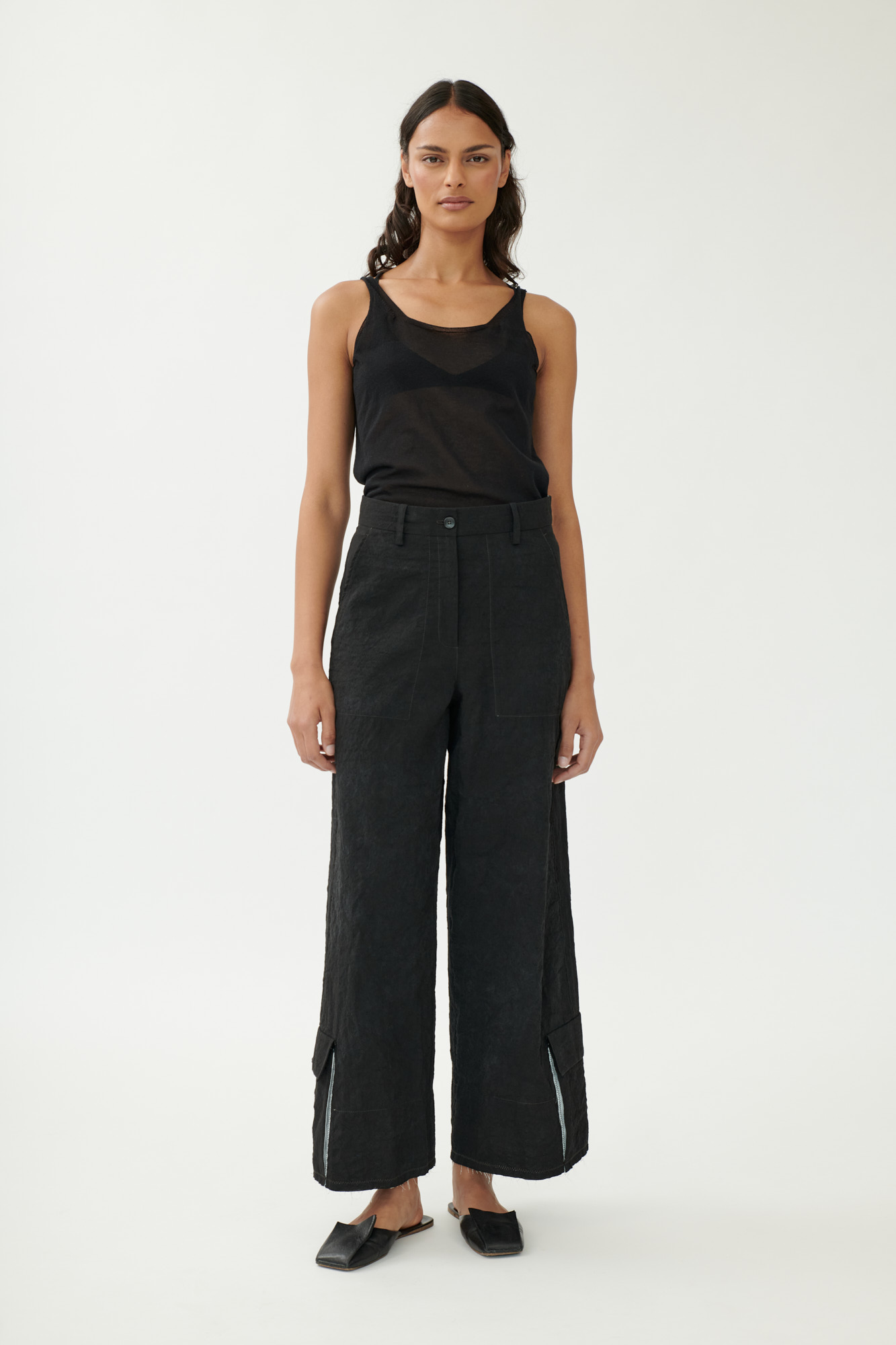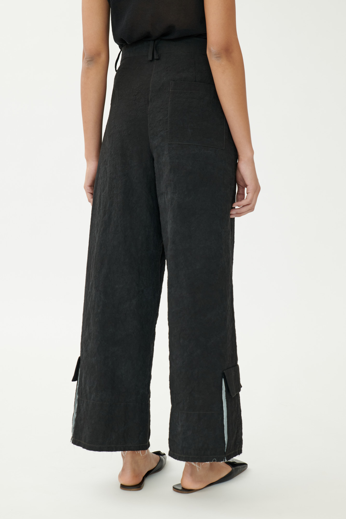 Diese weit geschnittene Hose kombiniert sportliche Funktion mit einem reduzierten Design. Cargotaschen, offene Saumkanten mit Kontrastbesatz und markante Zick-Zack-Steppungen stehen für eine stille Hommage an das Handwerk – sichtbar gemacht durch ehrliche, rohe Verarbeitungsdetails.