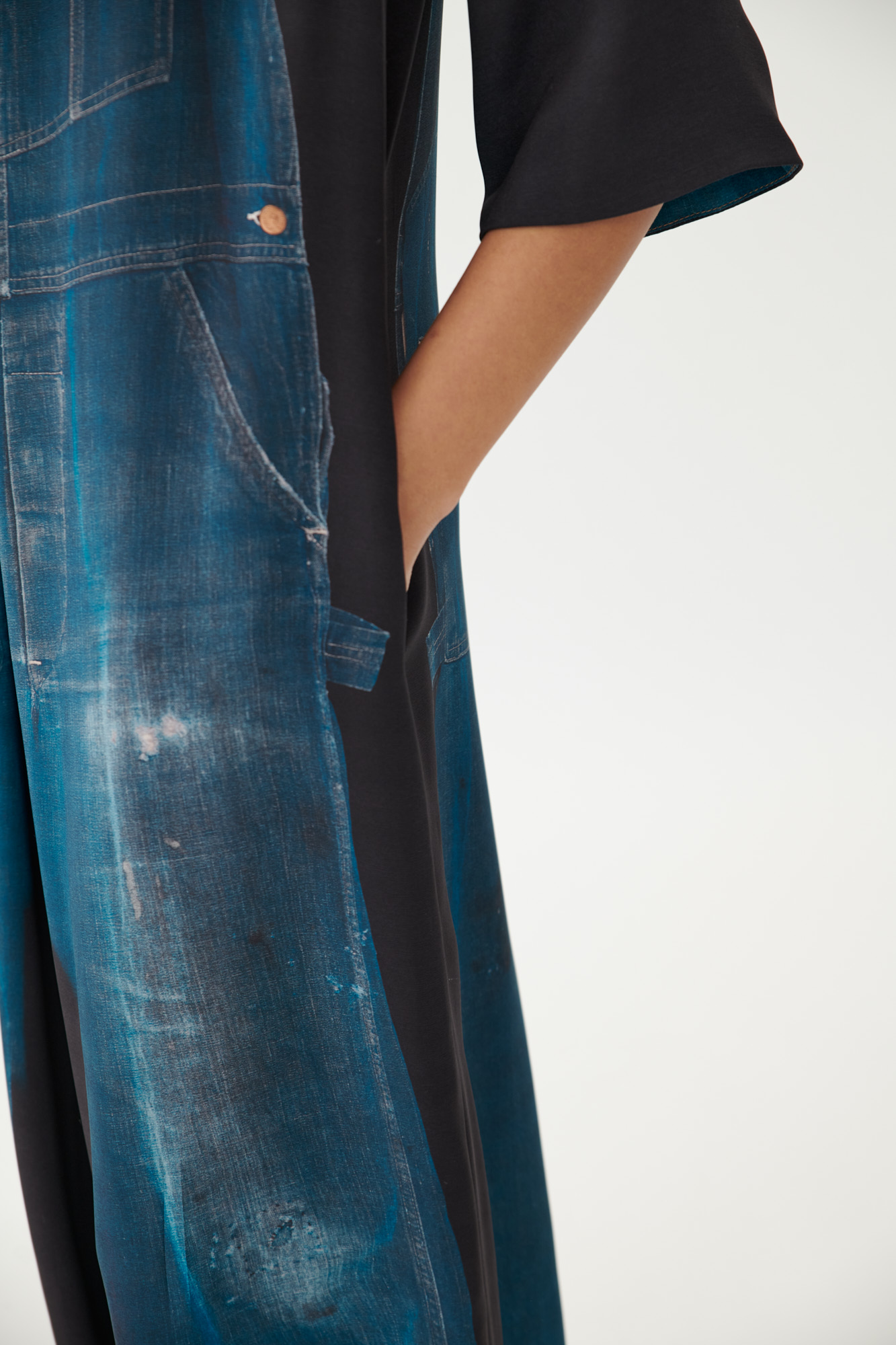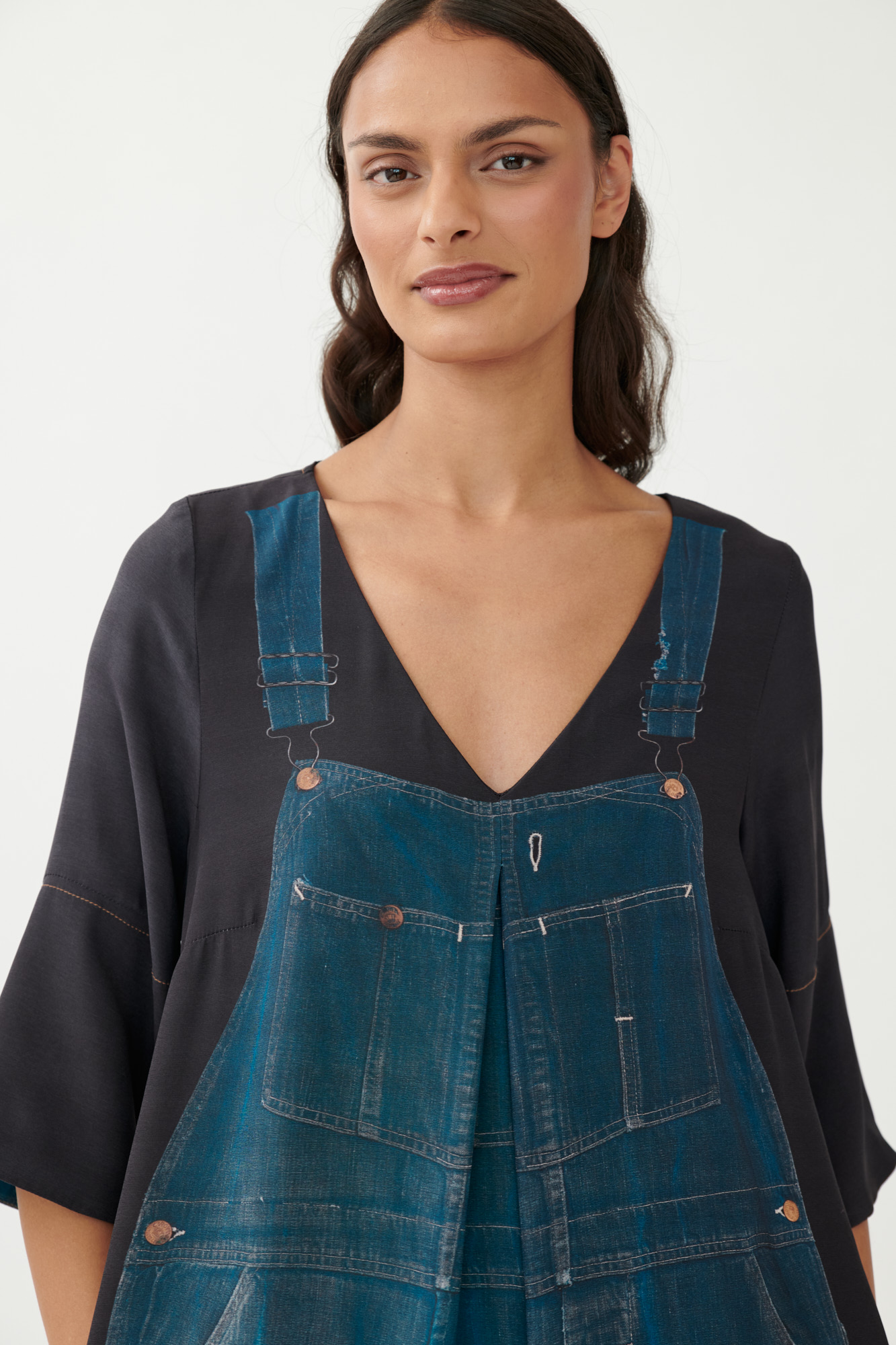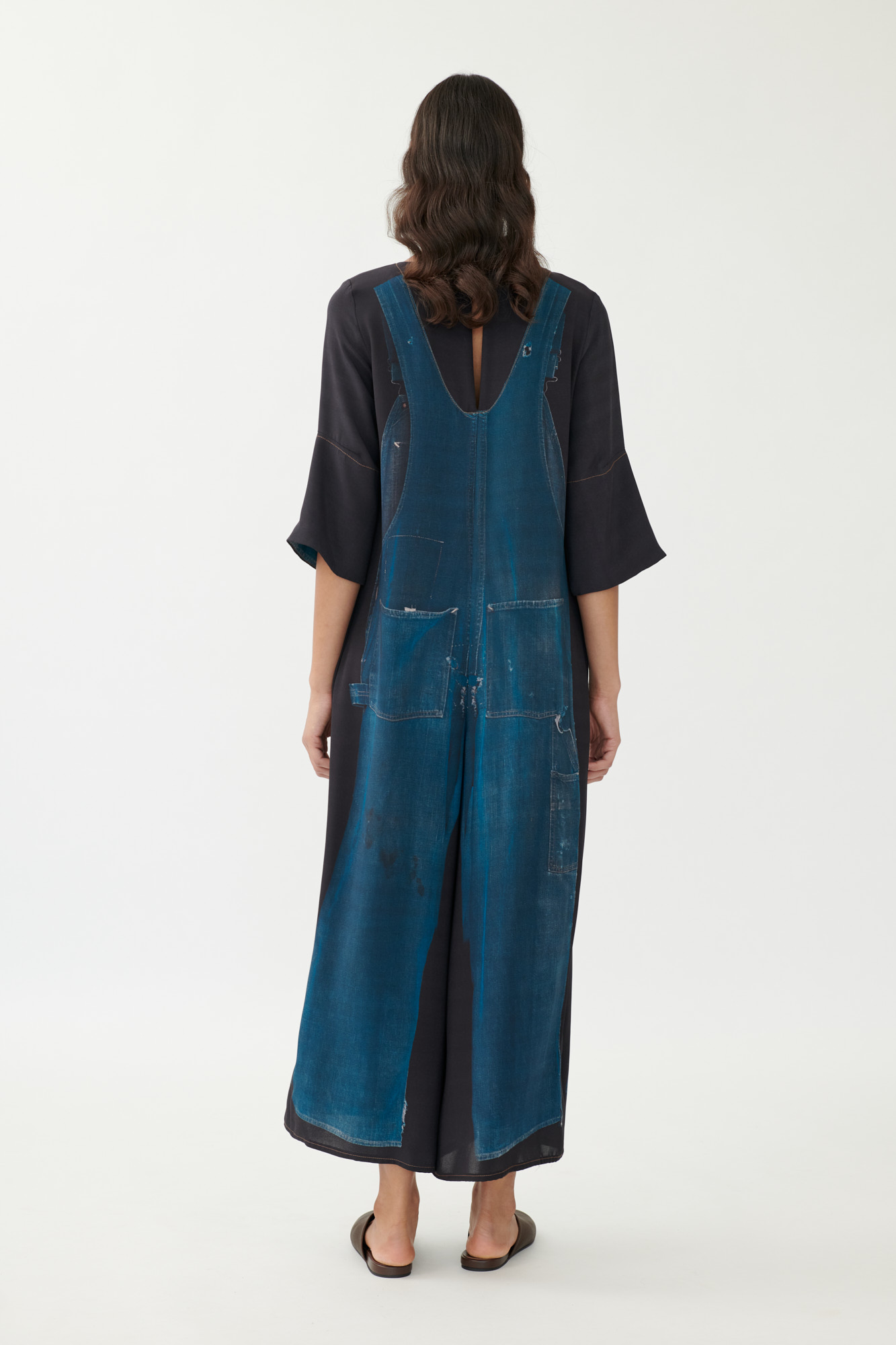 Dieser fließende Overall aus hochwertigem Seiden-Viskose-Material spielt mit dem Kontrast zwischen reduzierter Silhouette und fotorealistischem Trompe-l'œil-Print. Das Motiv zeigt einen klassischen Workwear-Overall aus Vintage-Denim – ein starker visueller Bruch auf dem weich fallenden Material. Der V-Ausschnitt mit geknöpftem Rückenschlitz, 3/4-Ärmel und eine Kellerfalte im Vorderteil runden das Design ab. In Farbe 08 erscheint das Modell schlicht und ohne Print.