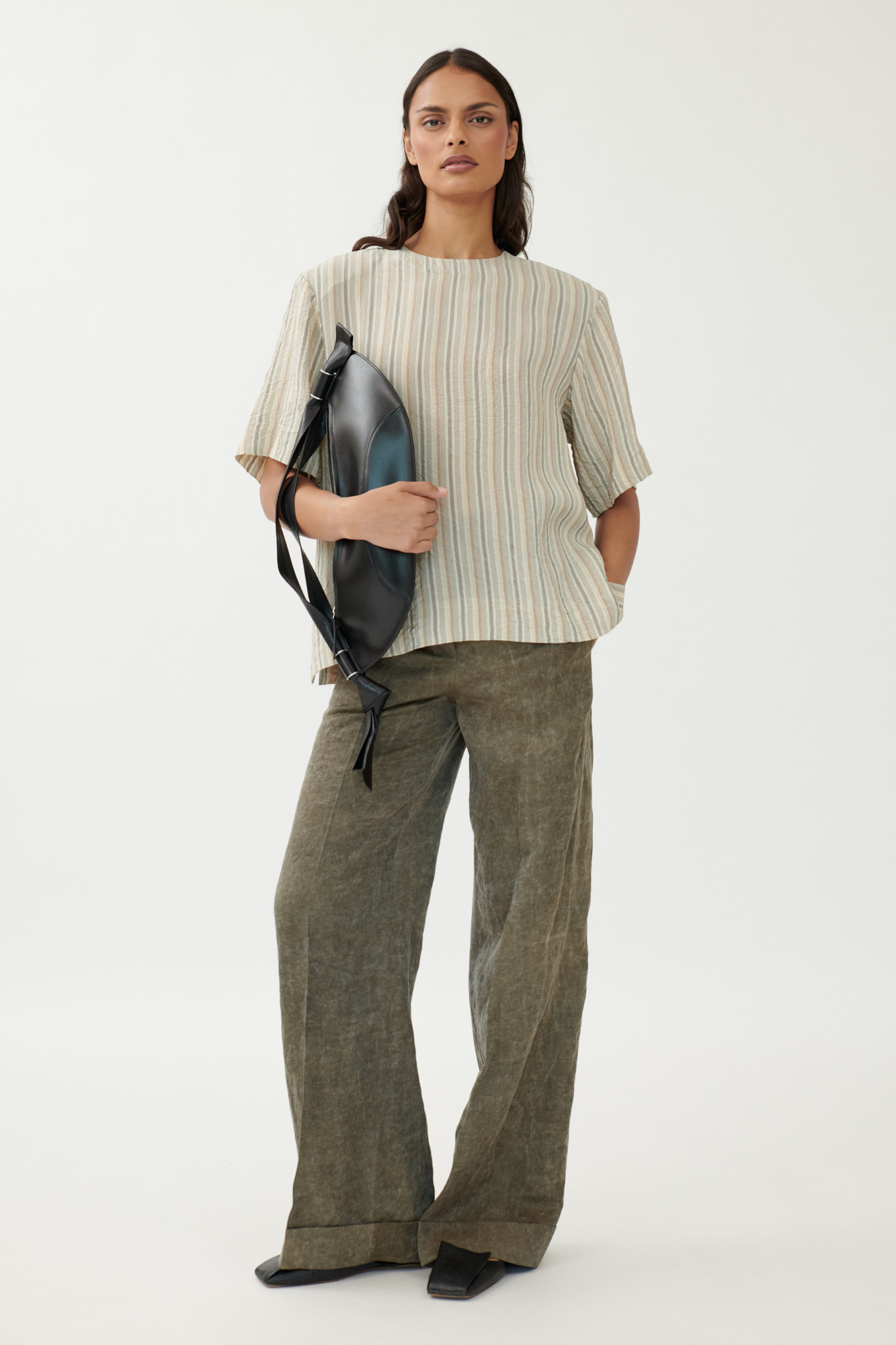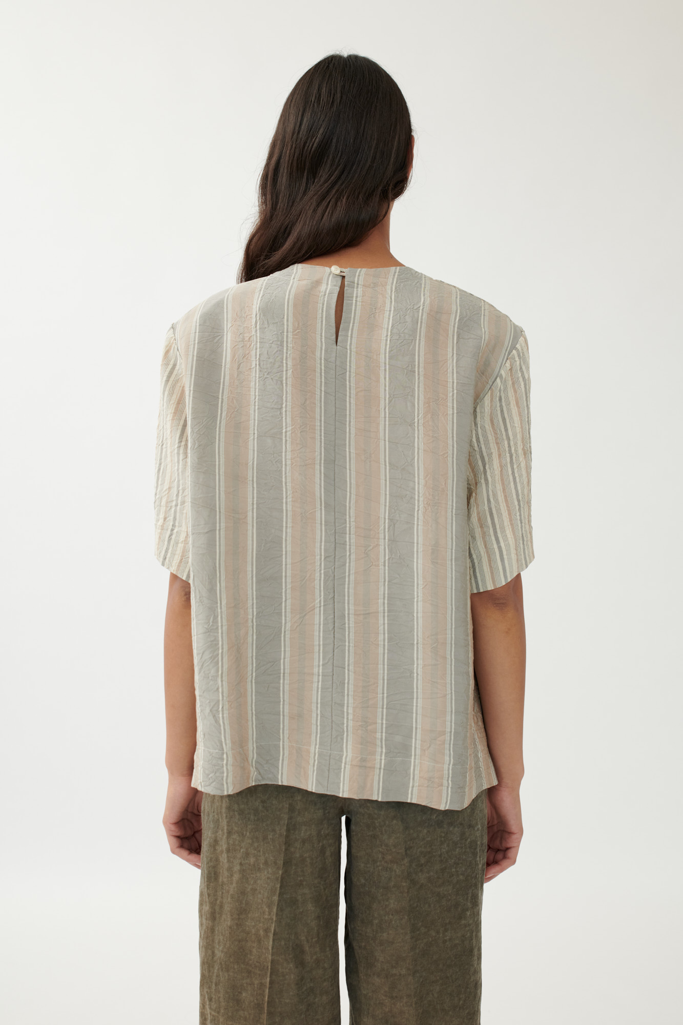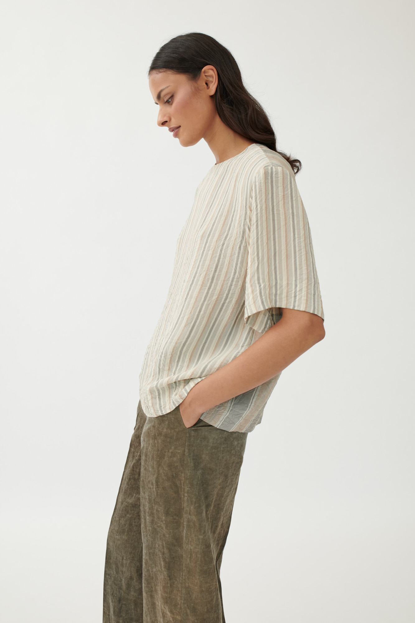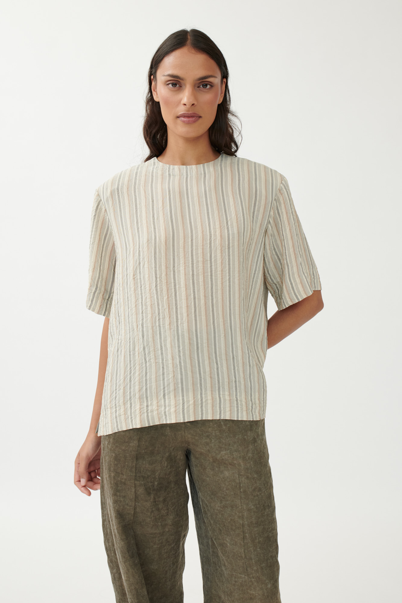 Dieses gerade geschnittene T-Shirt kombiniert klare Linien mit subtiler Struktur. Die herausnehmbaren Schulterpolster sorgen für eine markante Silhouette, während das fließende Viskosematerial in gewaschener Optik angenehmen Tragekomfort bietet. Unterschiedliche Streifenmuster unterstreichen die grafische Wirkung.