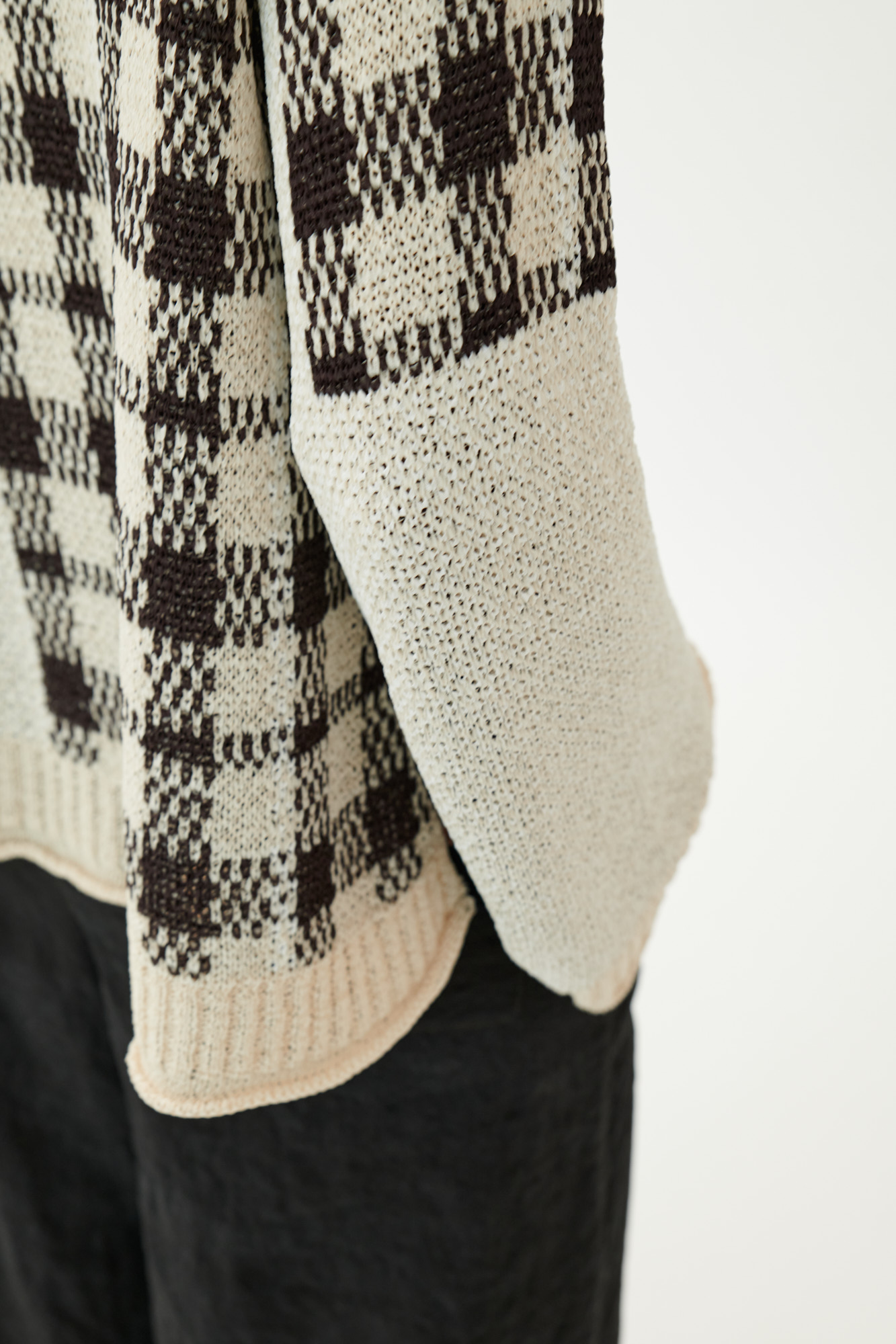 Kunstvoller Strukturmix trifft auf klare Silhouette: Dieser kastig geschnittene Pullover aus schwerer Viskose-Qualität zeigt ein grafisches Jacquardmuster in moderner Patchwork-Optik. Die glatte Oberfläche mit leicht körnigem Griff verleiht dem Design Tiefe und Präsenz. Der gerade Ausschnitt und die leicht ausgestellten Ärmel unterstreichen die klare Formensprache.