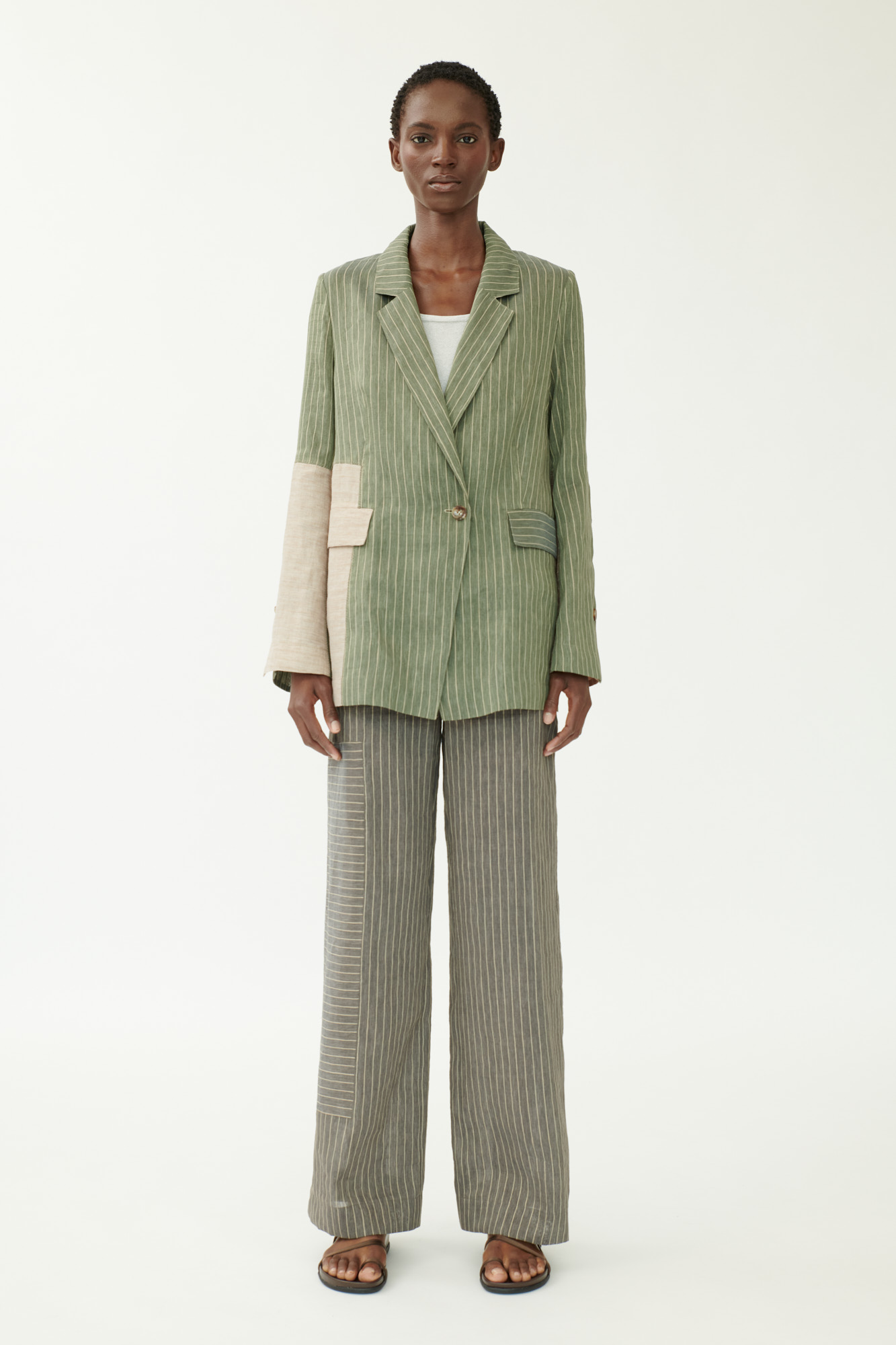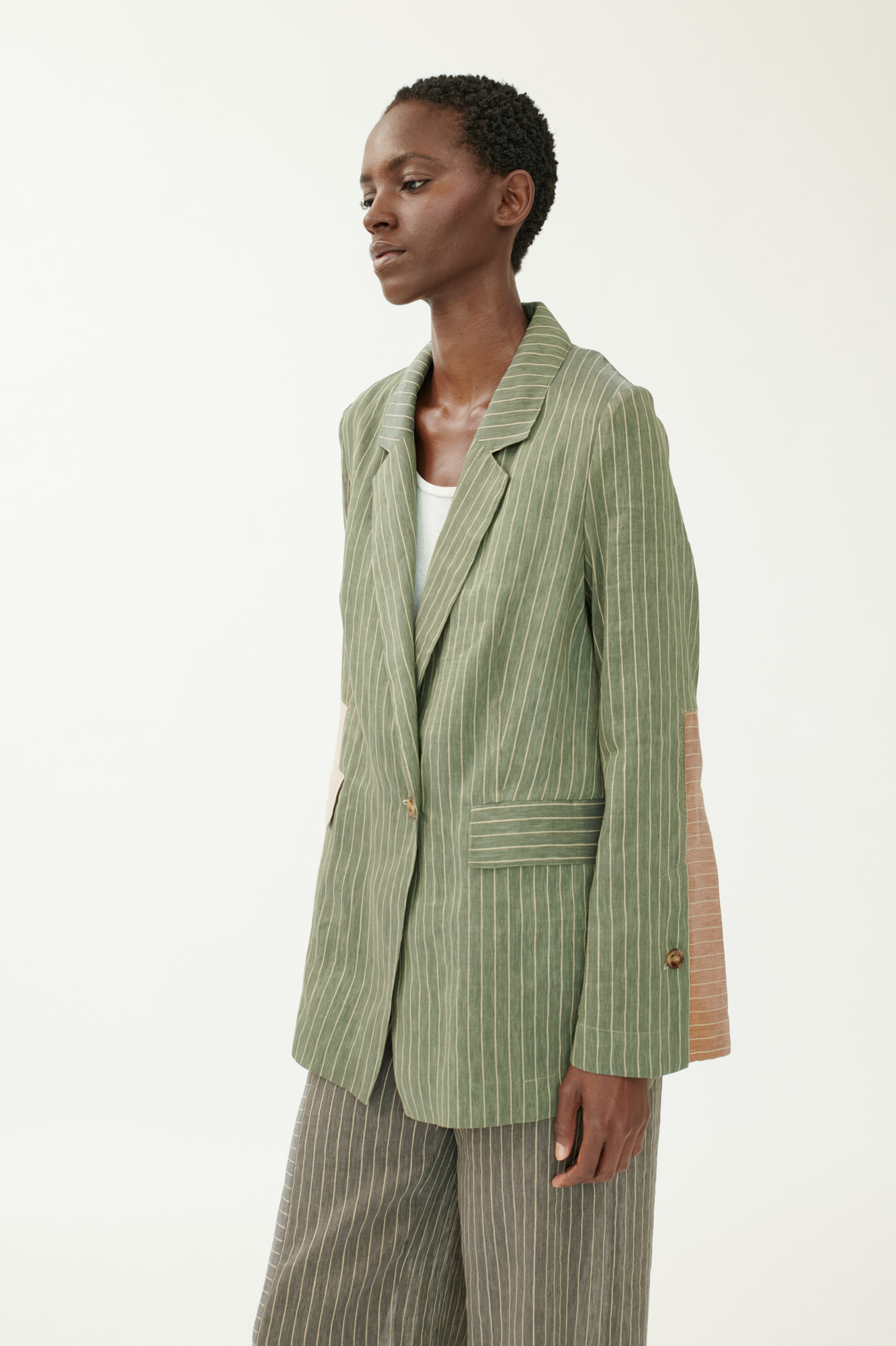 Dieser lässige Blazer spielt mit Streifen in unterschiedlichen Richtungen und subtilen Color-Blocking-Elementen. Durch den weiten Übertritt, die ausgestellten Ärmel und den langen Rückenschlitz mit Knopfdetail erhält das Modell eine besondere Dynamik. Das leichte Leinenmaterial mit feinen Nadelstreifen und seidenartiger Haptik verleiht dem Blazer eine sommerliche Leichtigkeit.