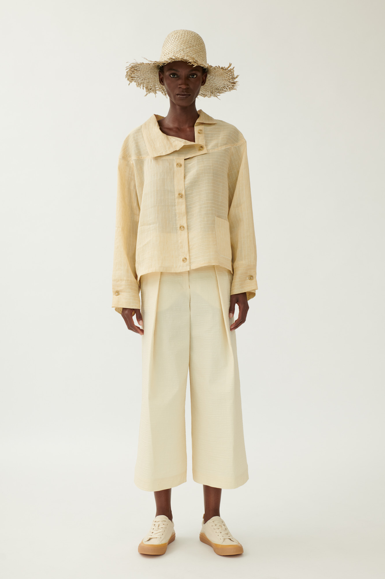 Diese weit geschnittene Bluse kombiniert vertikale und horizontale Streifen zu einem dezenten Patchwork-Look. Die asymmetrisch versetzte Knopfleiste, ein klarer Stehkragen und eine aufgesetzte Brusttasche sorgen für eine moderne, reduzierte Silhouette. Das sehr leichte Leinenmaterial mit Nadelstreifen wirkt edel und sommerlich zugleich.
