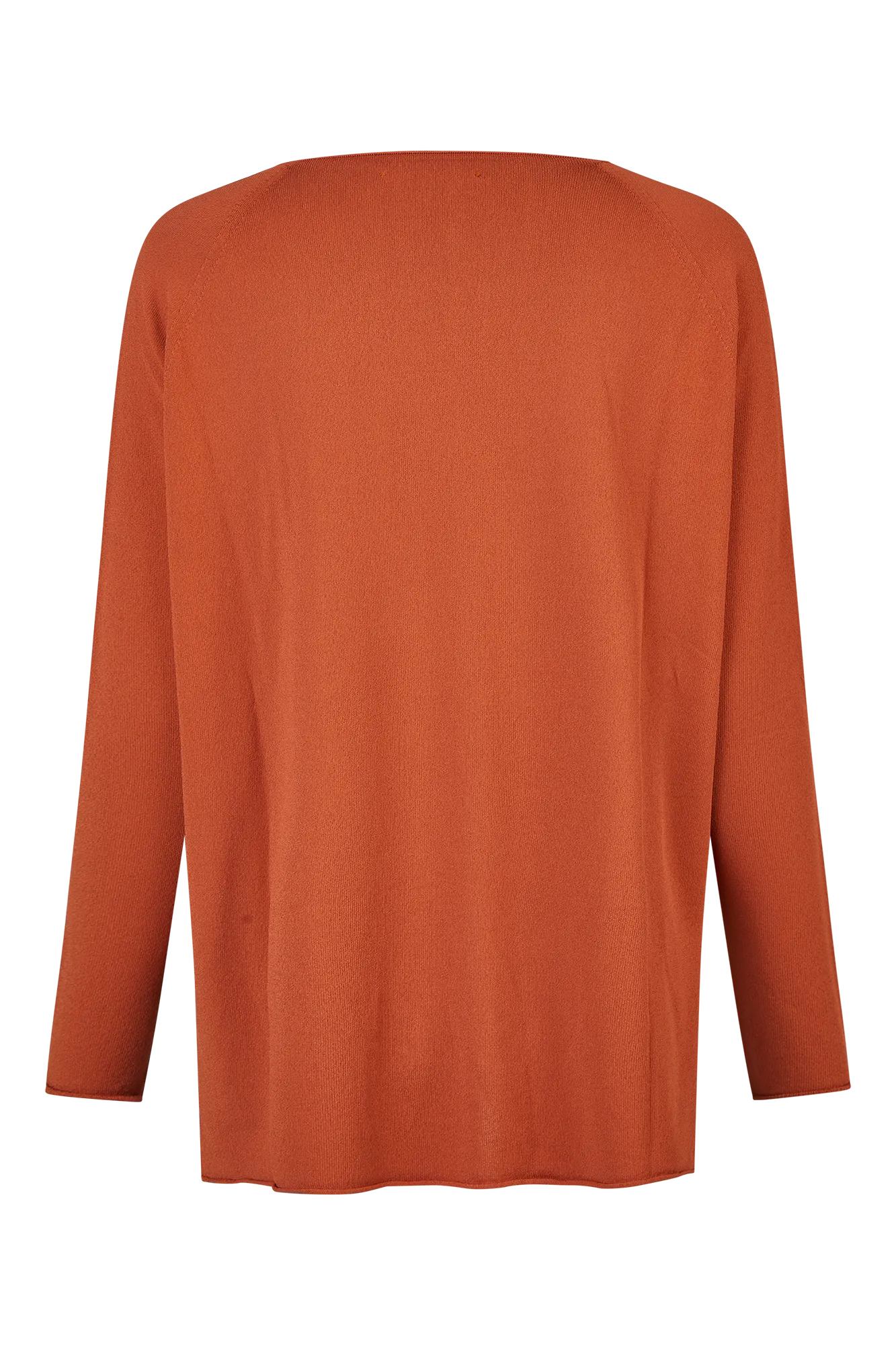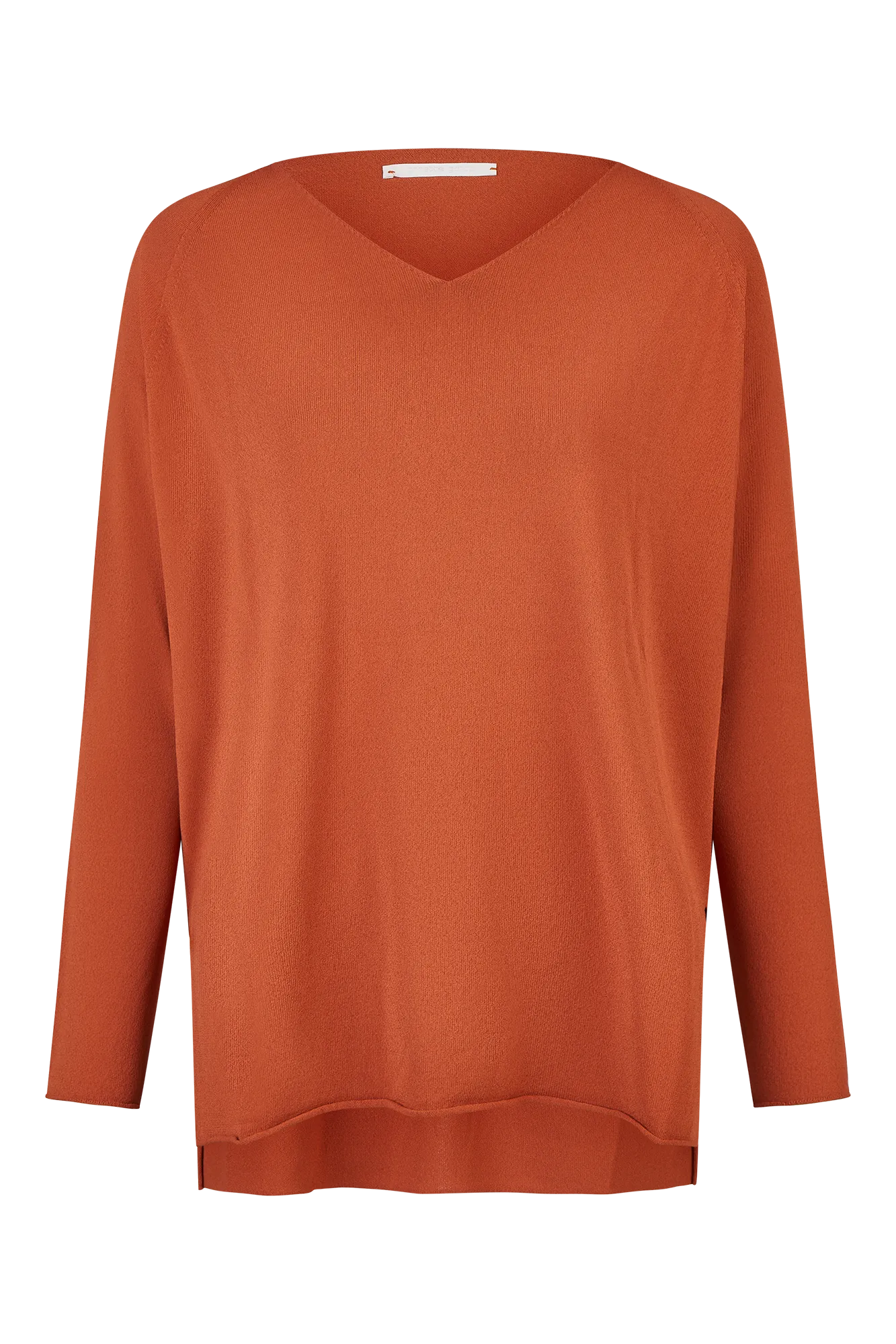 Langer Strickpullover mit geradem, weitem Schnitt und V-Ausschnitt. Die klare Silhouette wird durch seitliche Schlitze und schmale Ärmel ausbalanciert. Die nahtlose Verarbeitung reduziert Verschnitt und sorgt für ein besonders angenehmes Tragegefühl. Der feine Viskosegarn verleiht dem Modell eine glatte, leicht kühlende Oberfläche.