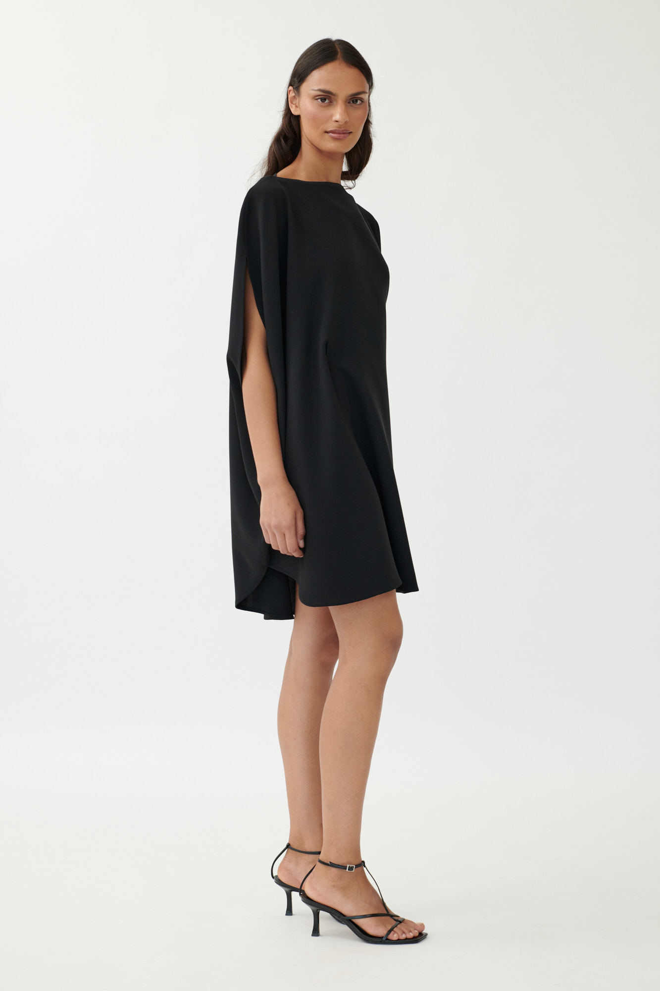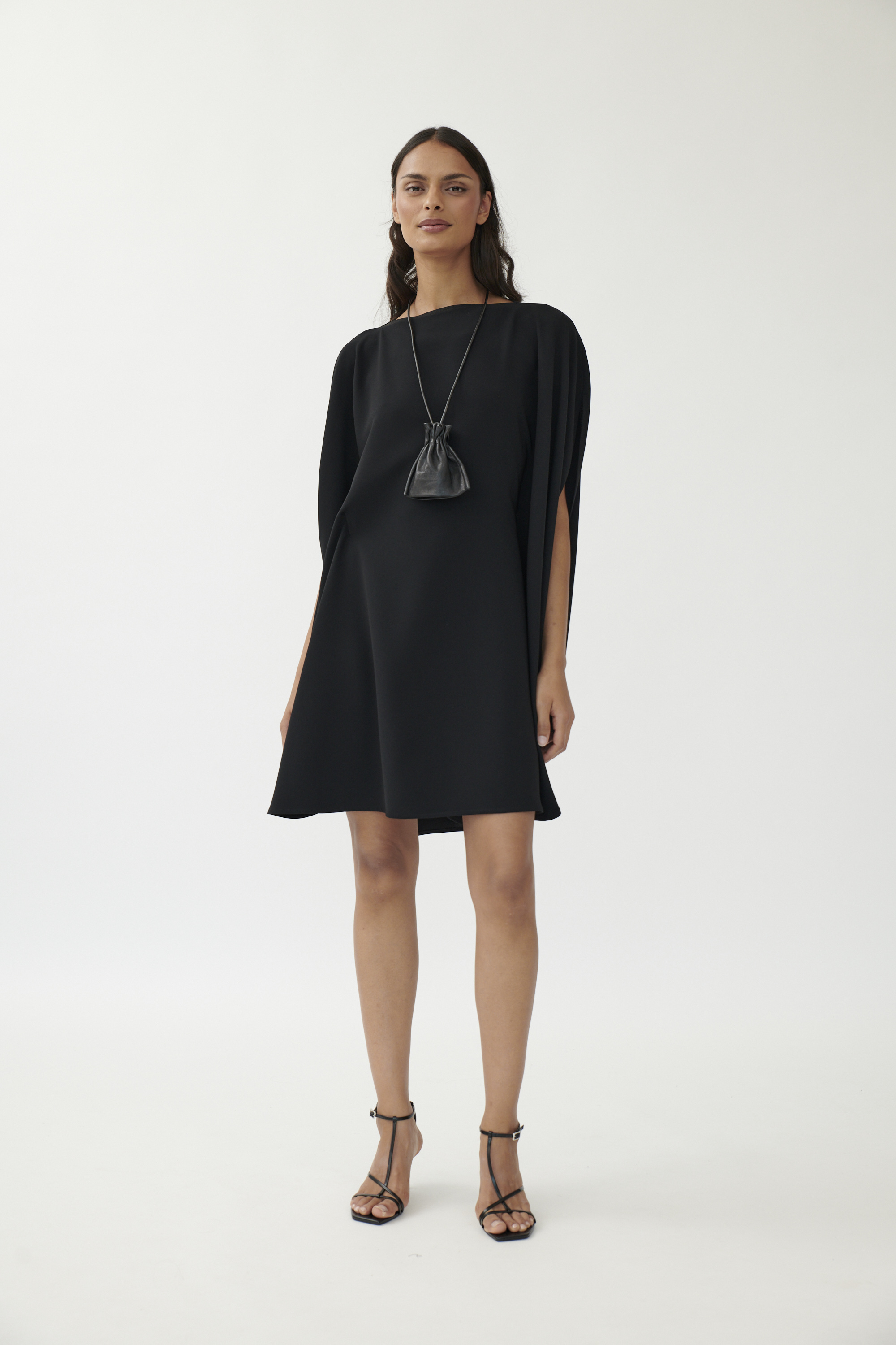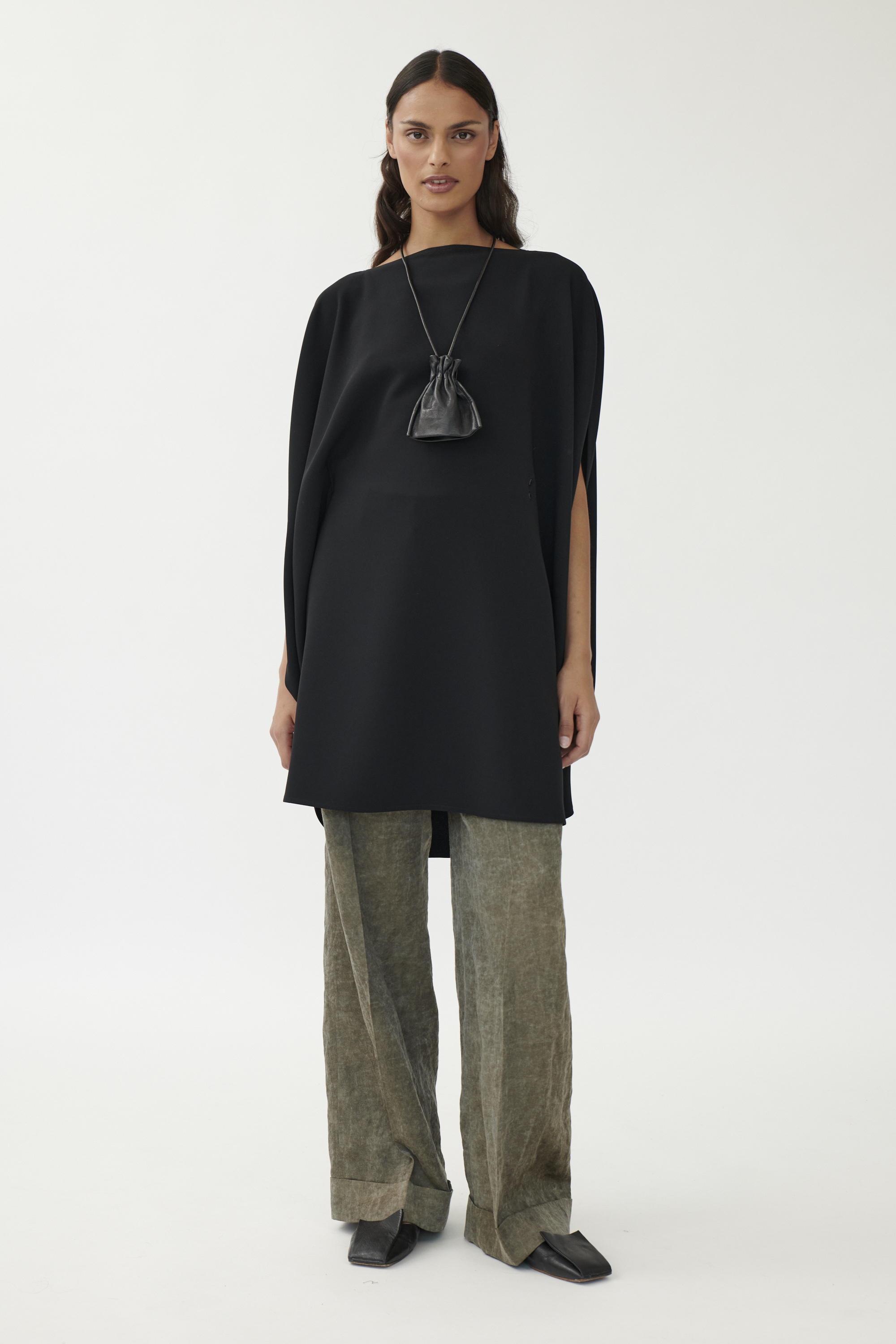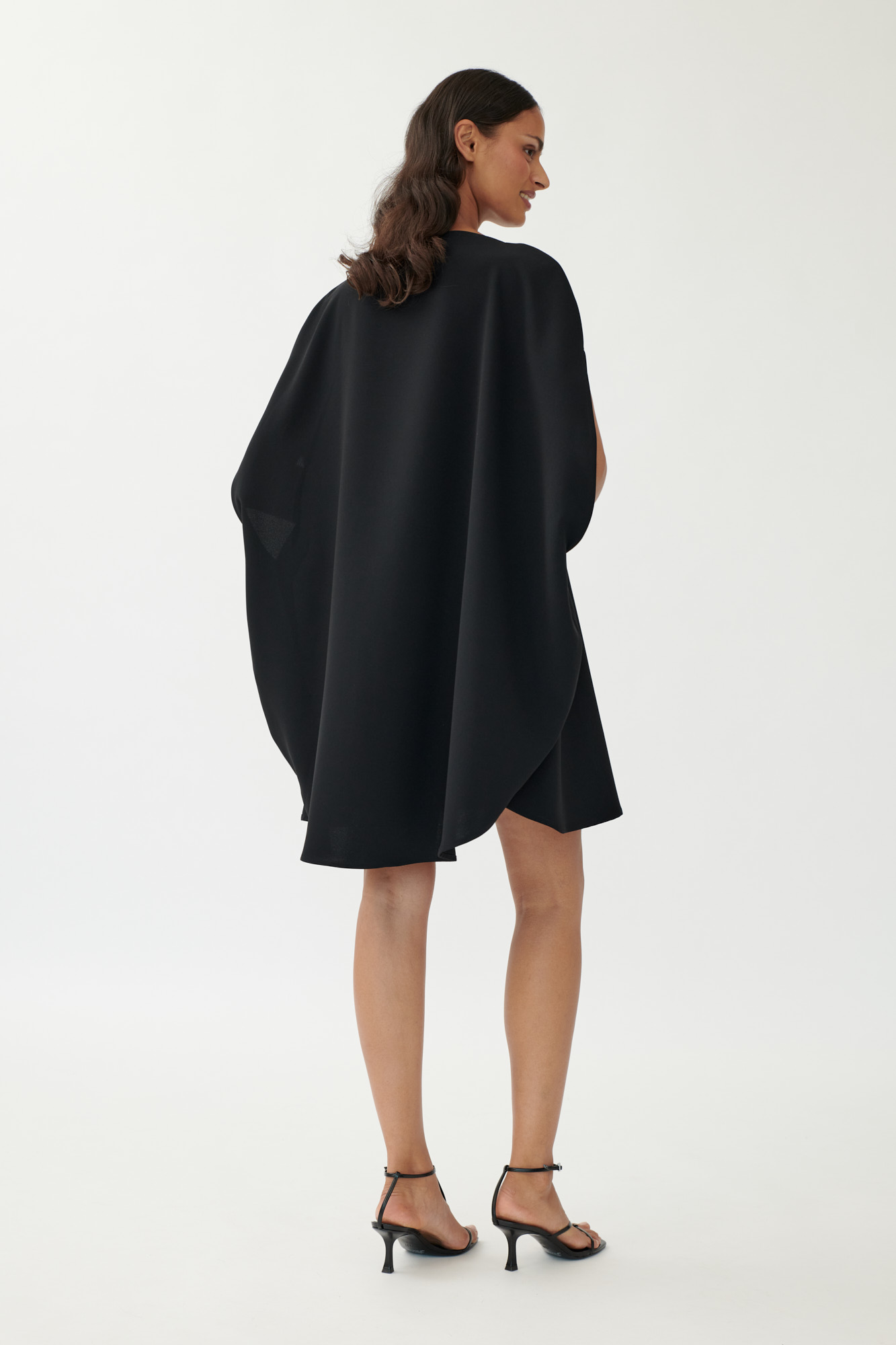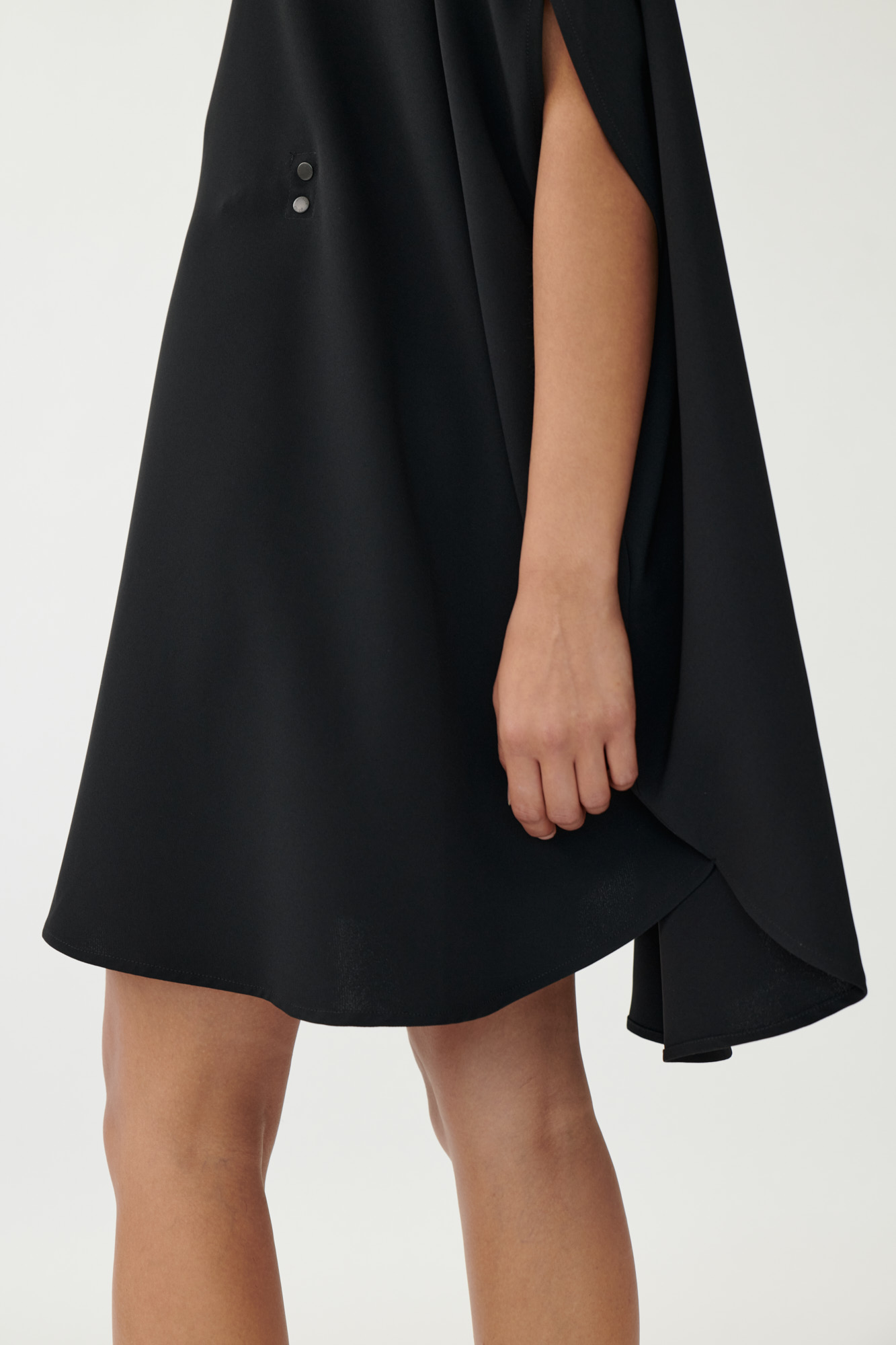 Dieses kreisförmige Kleid aus hochwertigem japanischem Triacetat verbindet eine skulpturale Form mit angenehmer Bewegungsfreiheit. Der U-Boot-Ausschnitt, die überschnittenen Schultern und der unsichtbare Taillengürtel betonen dezent die Silhouette. Das fließende Material mit Crêpe-Charakter erinnert optisch an Seide, ist aber deutlich pflegeleichter und knitterarm.