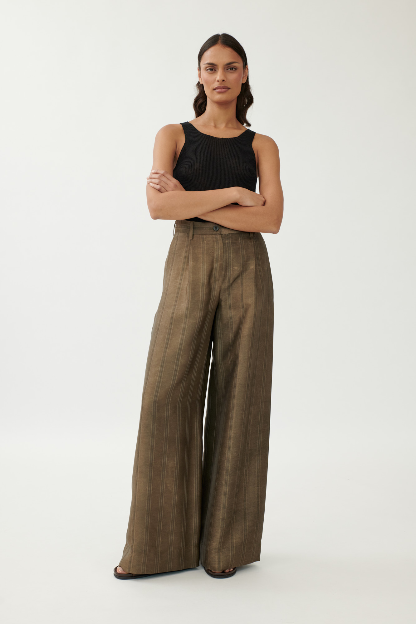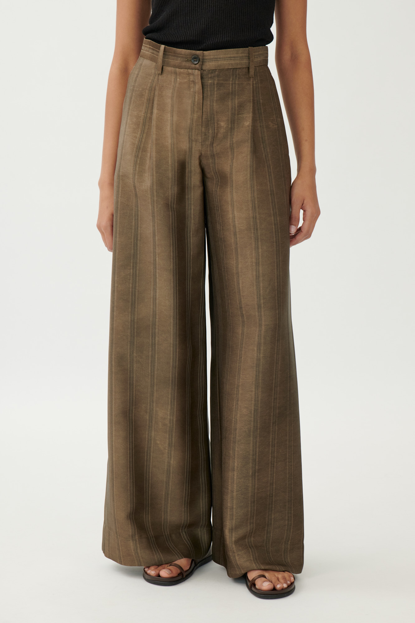 Diese locker geschnittene Hose verbindet klassische Eleganz mit moderner Materialität. Die feine Streifenstruktur wird durch die dezente Colddye-Färbung betont, das Material wirkt leicht glänzend und weich fließend. Kleine Bundfalten und eine klare Linienführung sorgen für eine zeitlose Silhouette mit komfortablem Sitz.