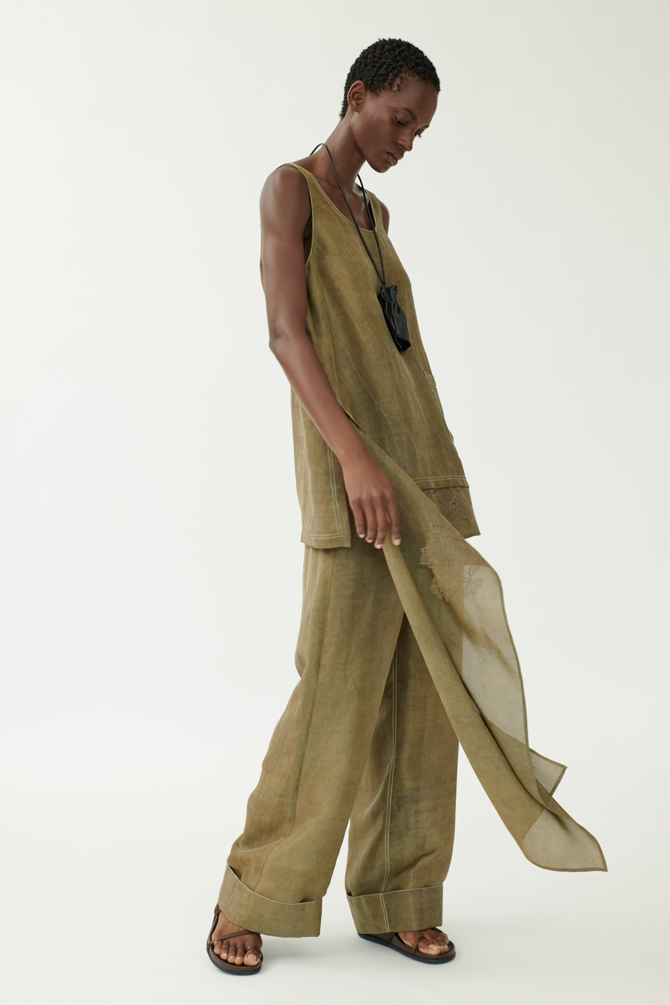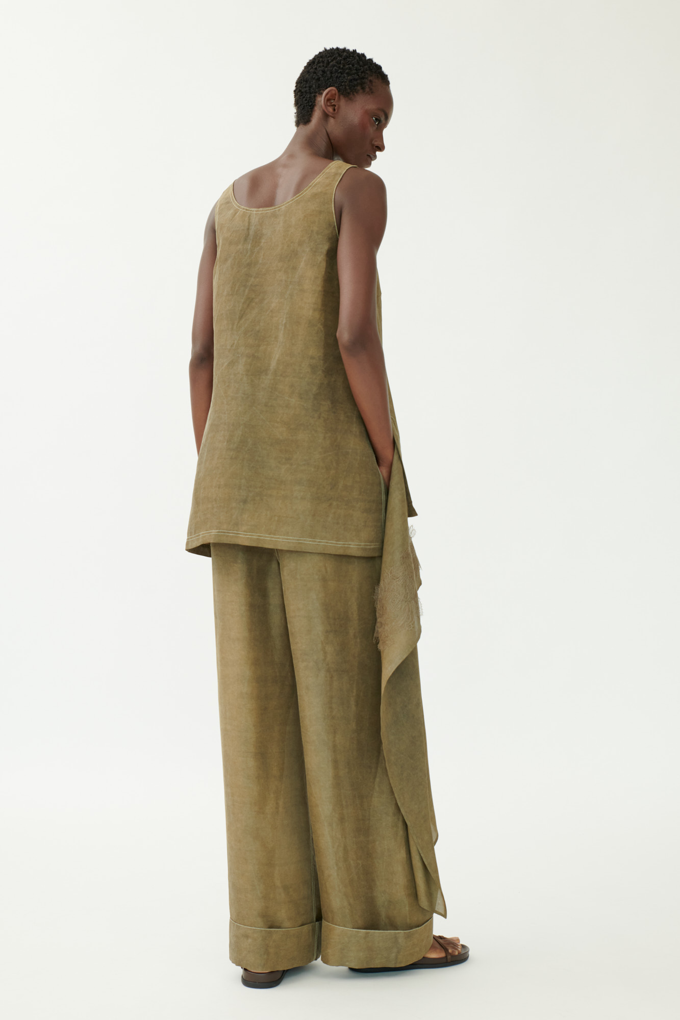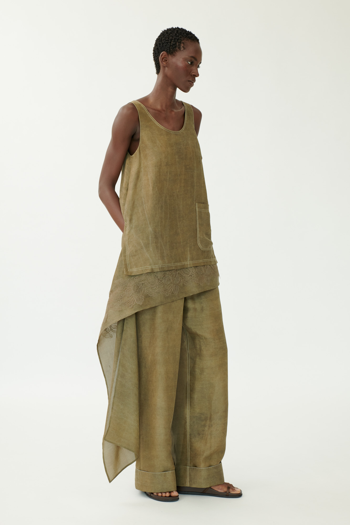 Dieses elegante Trägertop aus hochwertiger Crêpe-Seide spielt mit Asymmetrie und Lingerie-Details. Die mehrfach gefärbte Seide sorgt für Tiefe und Struktur, während die Drapierung am Saum mit feiner Spitze einen femininen Akzent setzt. Eine aufgesetzte Tasche und sportliche Steppdetails verleihen dem Design eine moderne Note.