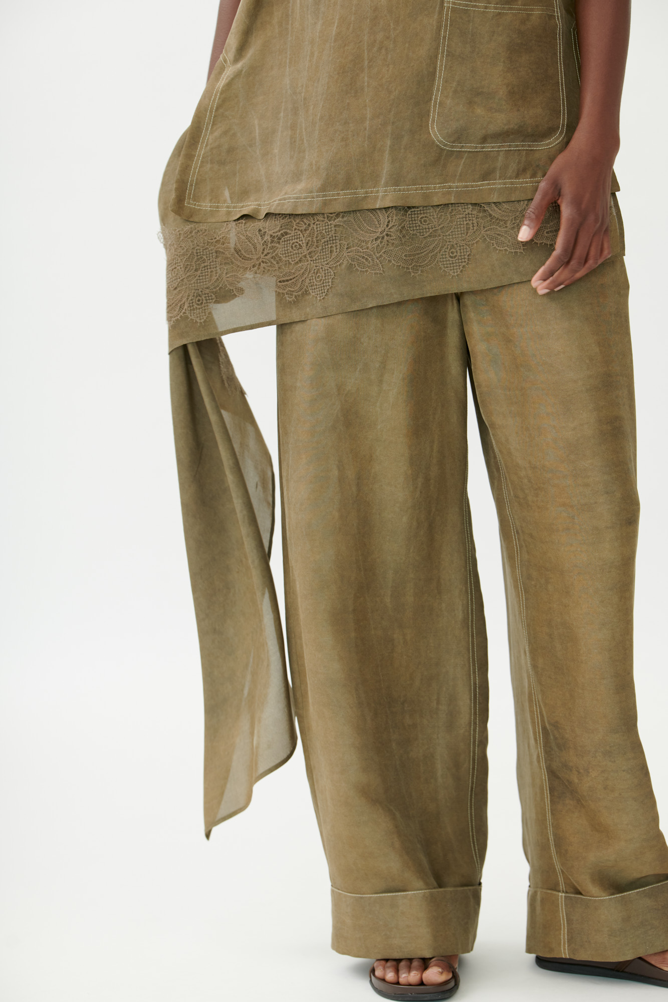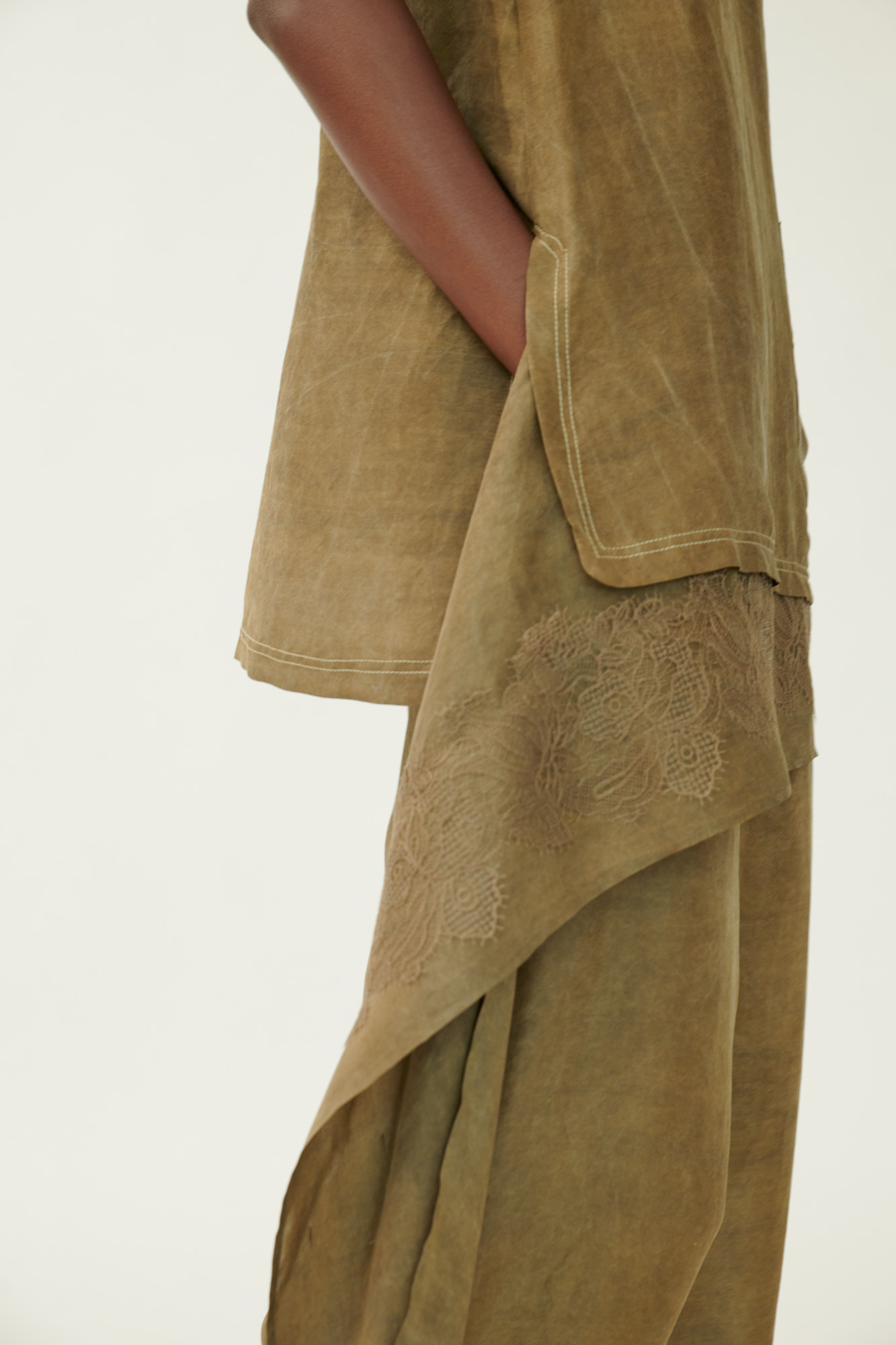 • Asymmetrischer Saum mit Drapierung und zarter Spitze
