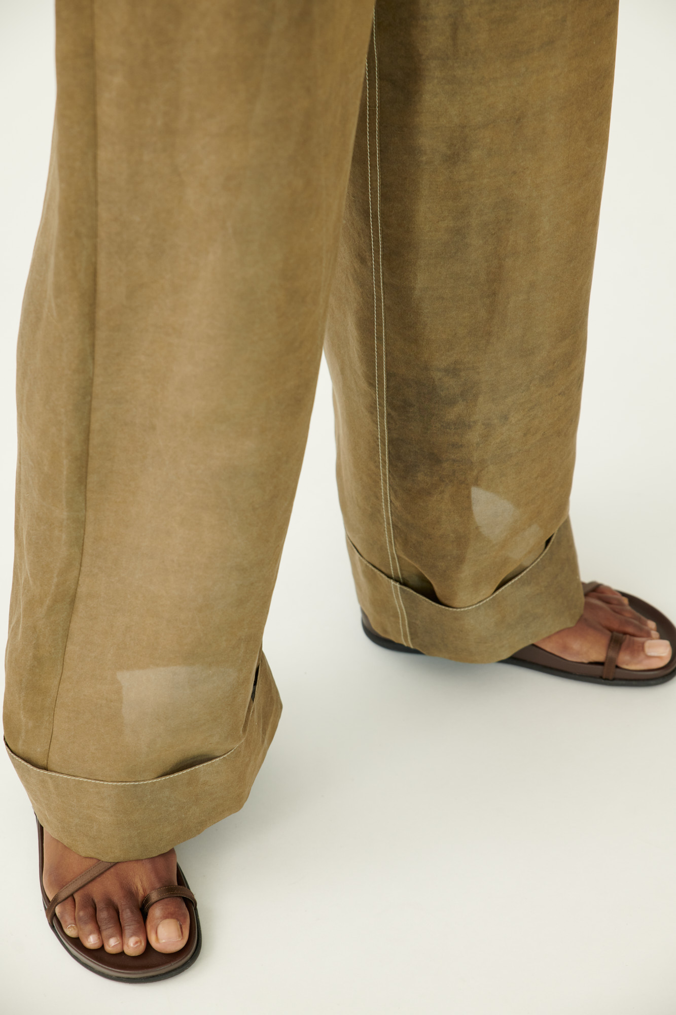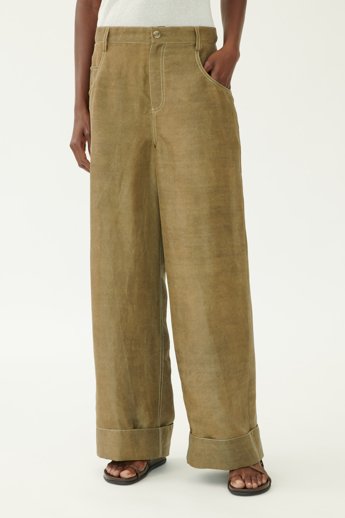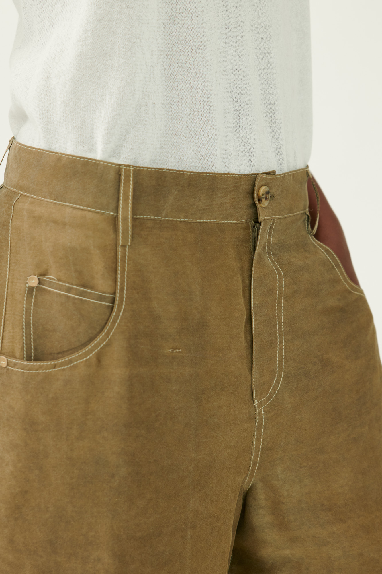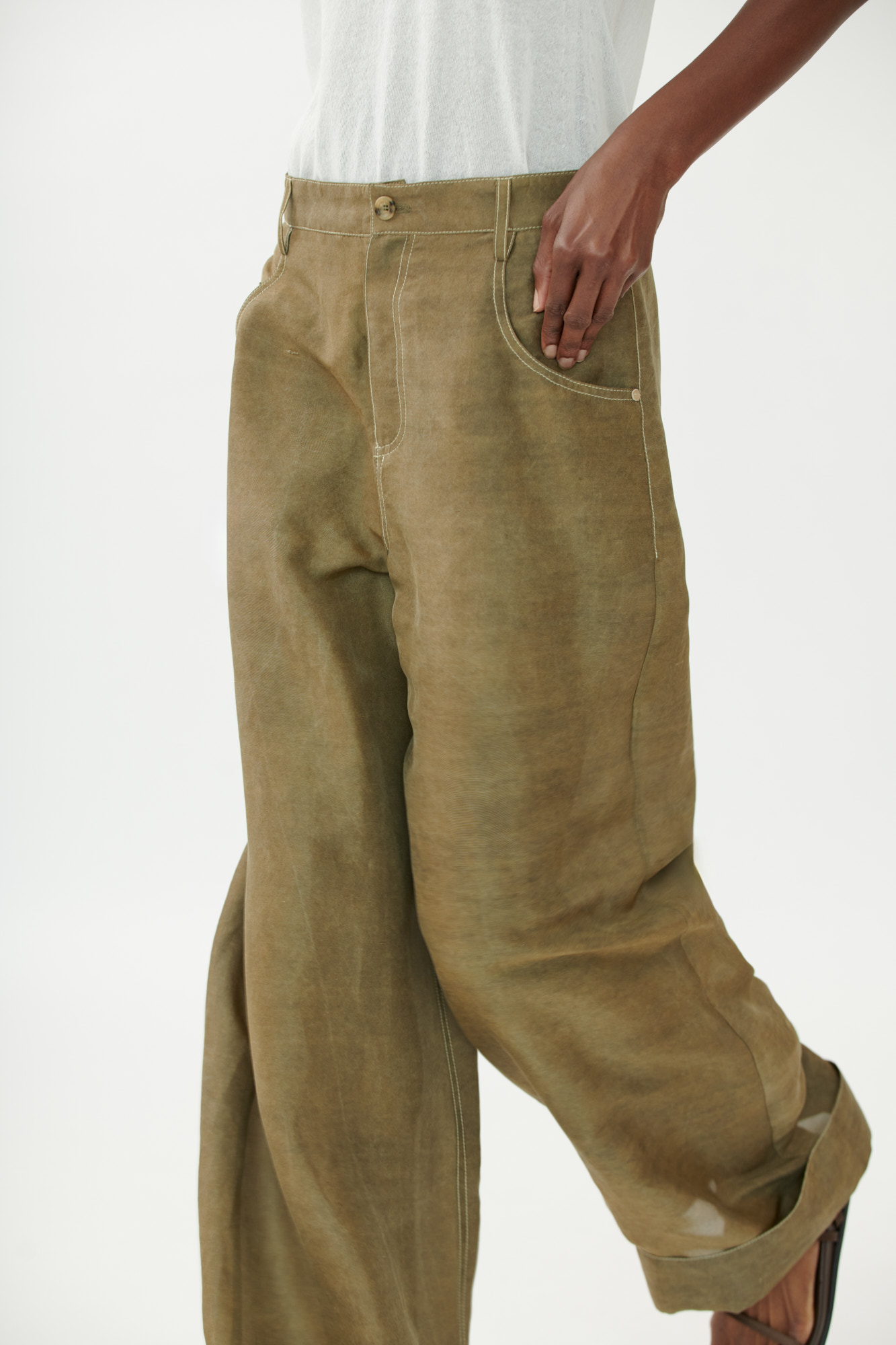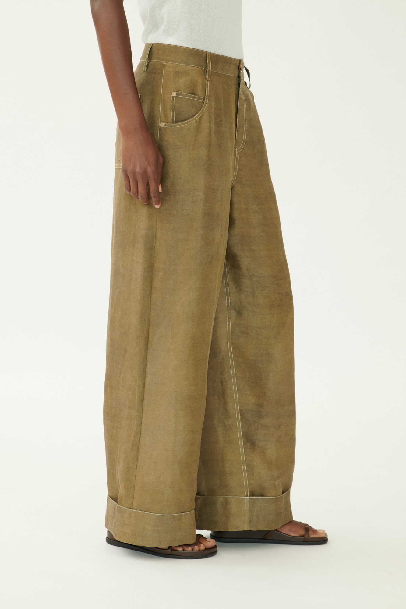 Diese weit geschnittene Hose vereint den klassischen Five-Pocket-Stil mit luxuriösem Material. Die mehrfach gefärbte Crêpe-Seide sorgt für Tiefe und Lebendigkeit im Farbton. Sportliche Steppdetails und der lässige Umschlag am Saum unterstreichen den modernen Charakter.
