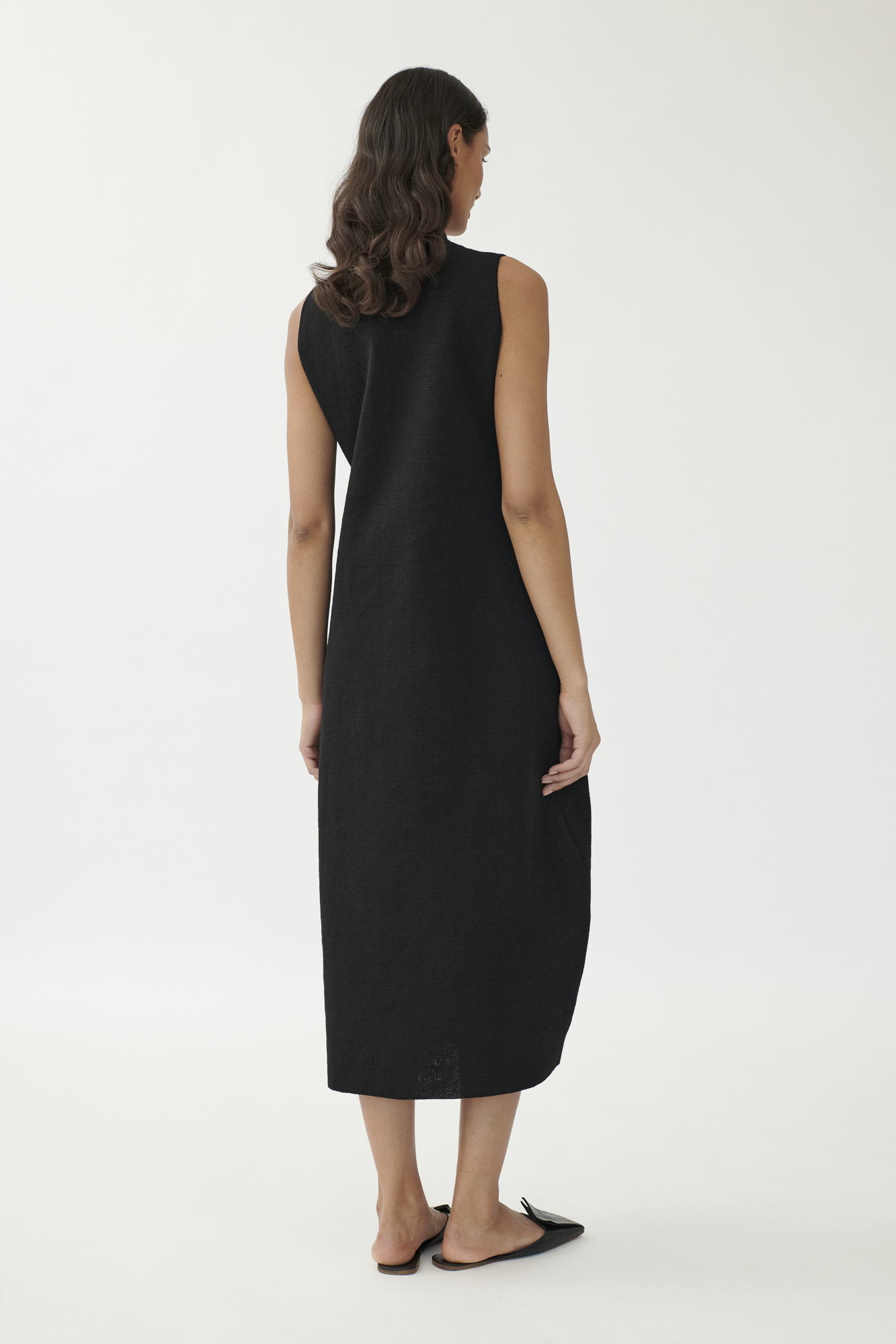 Ein reduziertes Design mit subtilem Volumen: Dieses ärmellose Strickkleid überzeugt durch klare Linien und fein strukturierte Materialität. Der feste Milano-Strick aus Leinen und Seide formt eine moderne Silhouette – körpernah an Brust und Saum, mit leicht ausgestelltem Bein in O-Form. Der kurze Stehkragen läuft in einen tiefen V-Ausschnitt aus und sorgt für einen markanten, aber femininen Abschluss.