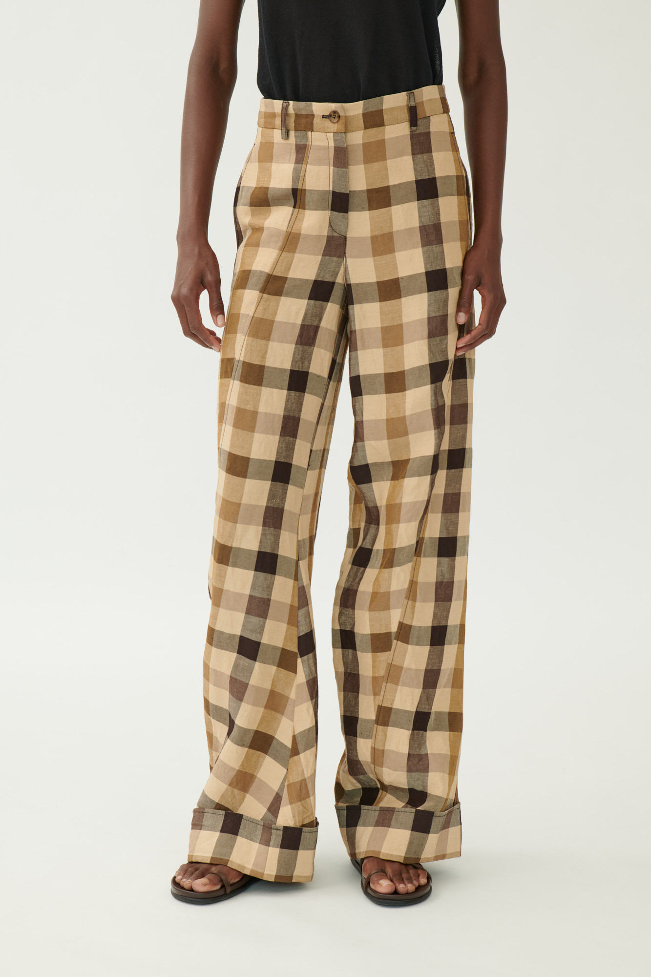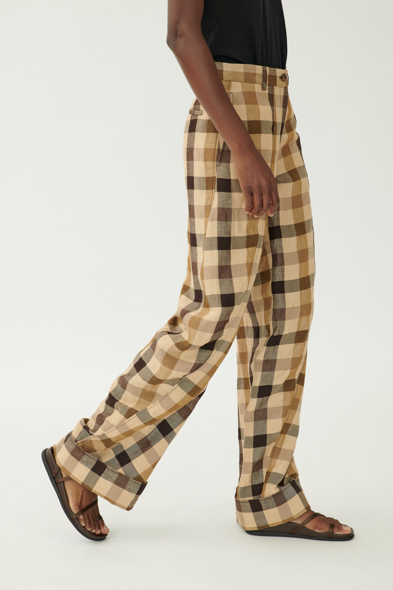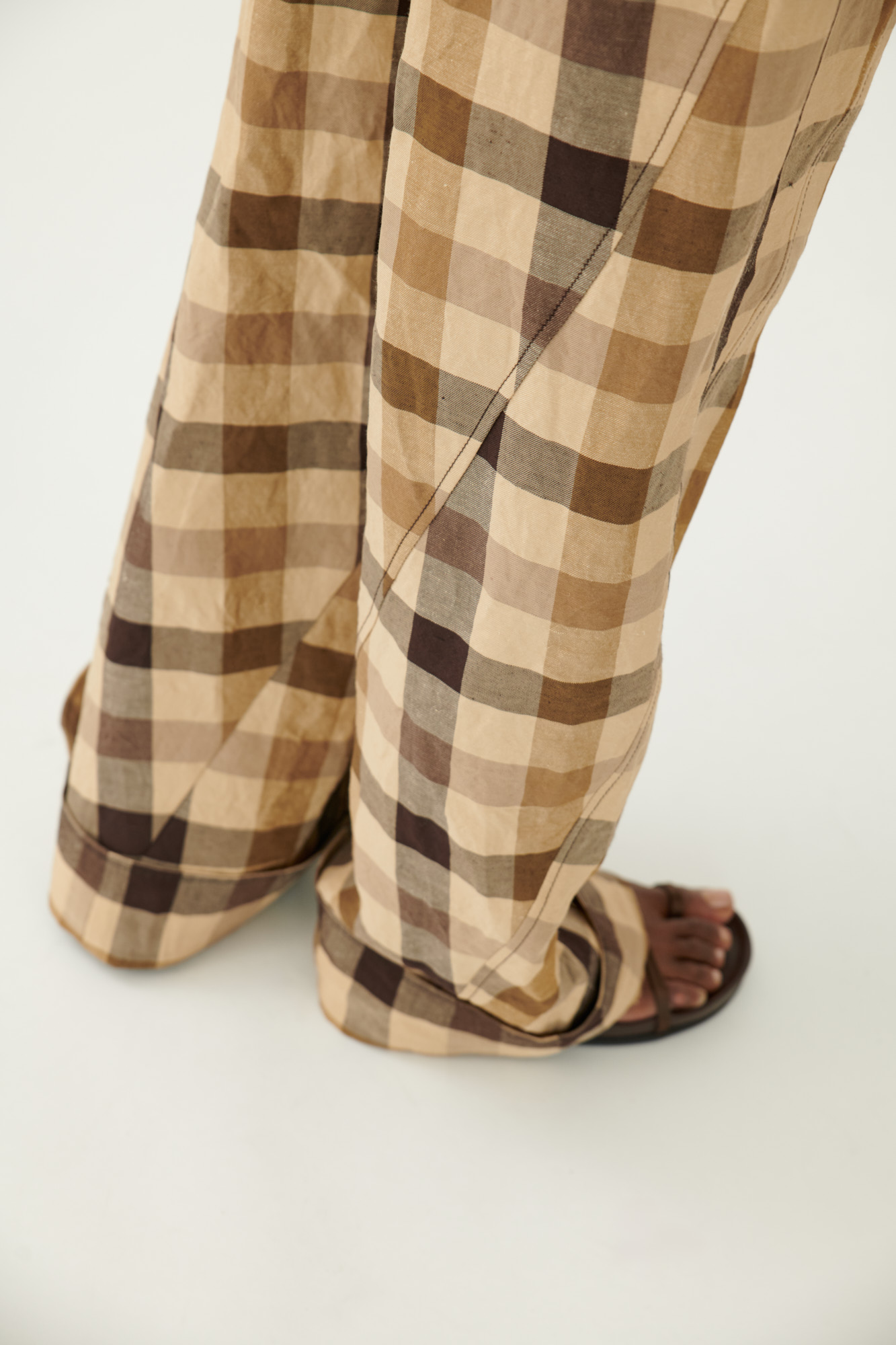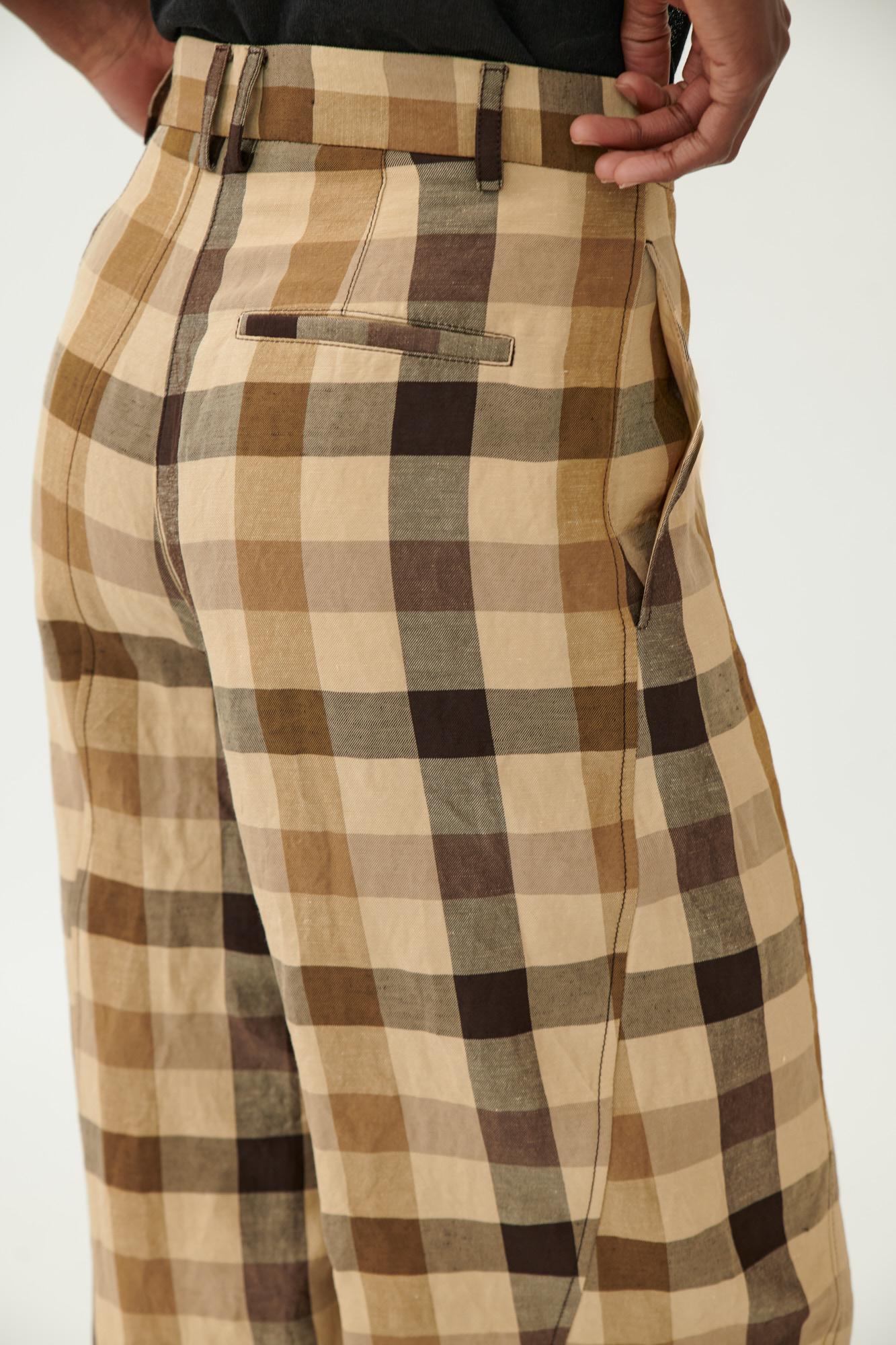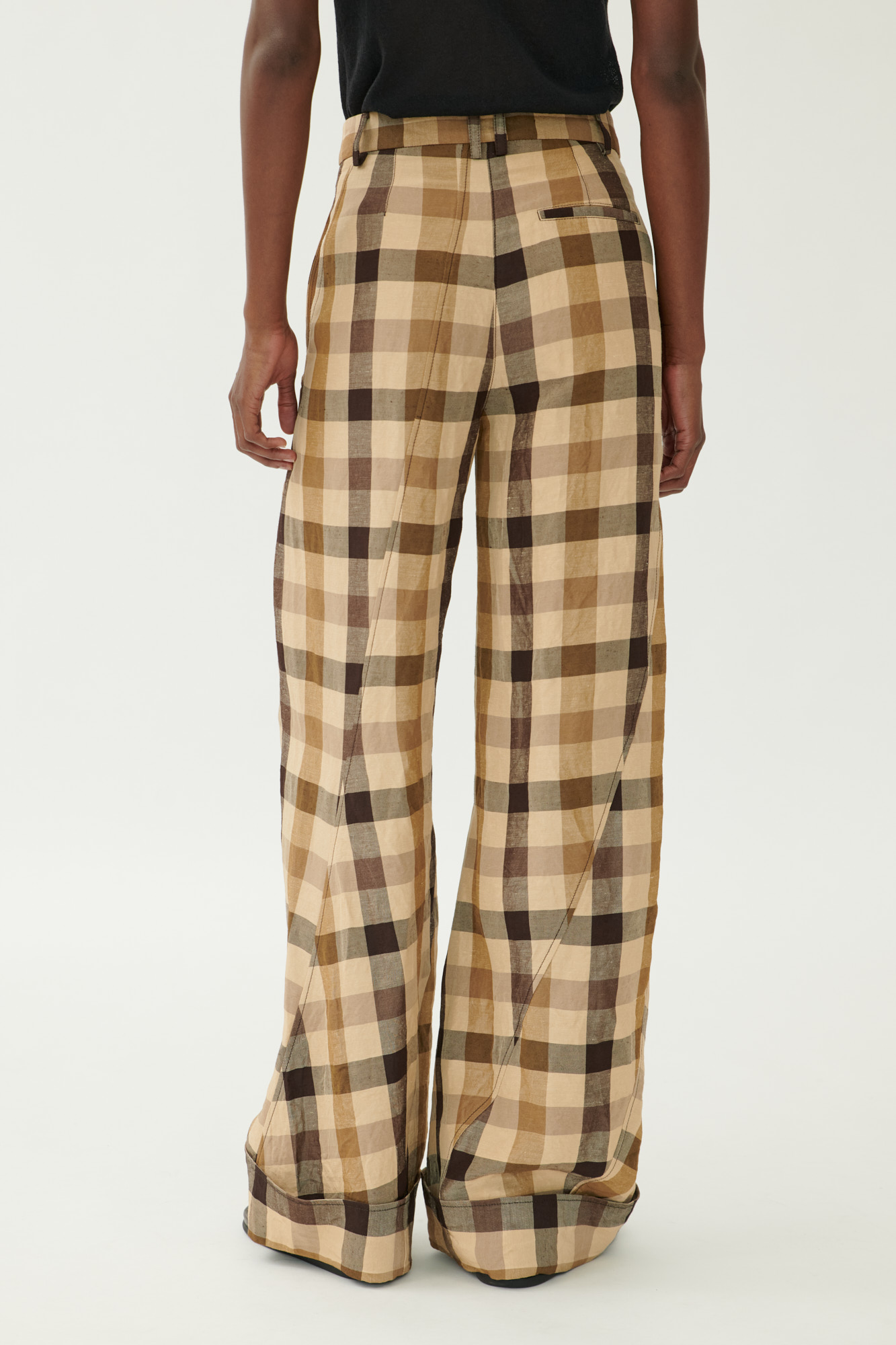 Ausdrucksstarke Hose in gedrehter Schnittführung, die durch asymmetrische Teilungsnähte eine skulpturale Silhouette erzeugt. Das karierte Material aus Leinen und Viskose hat eine weiche, gewaschene Haptik und bietet gleichzeitig Struktur und Leichtigkeit.