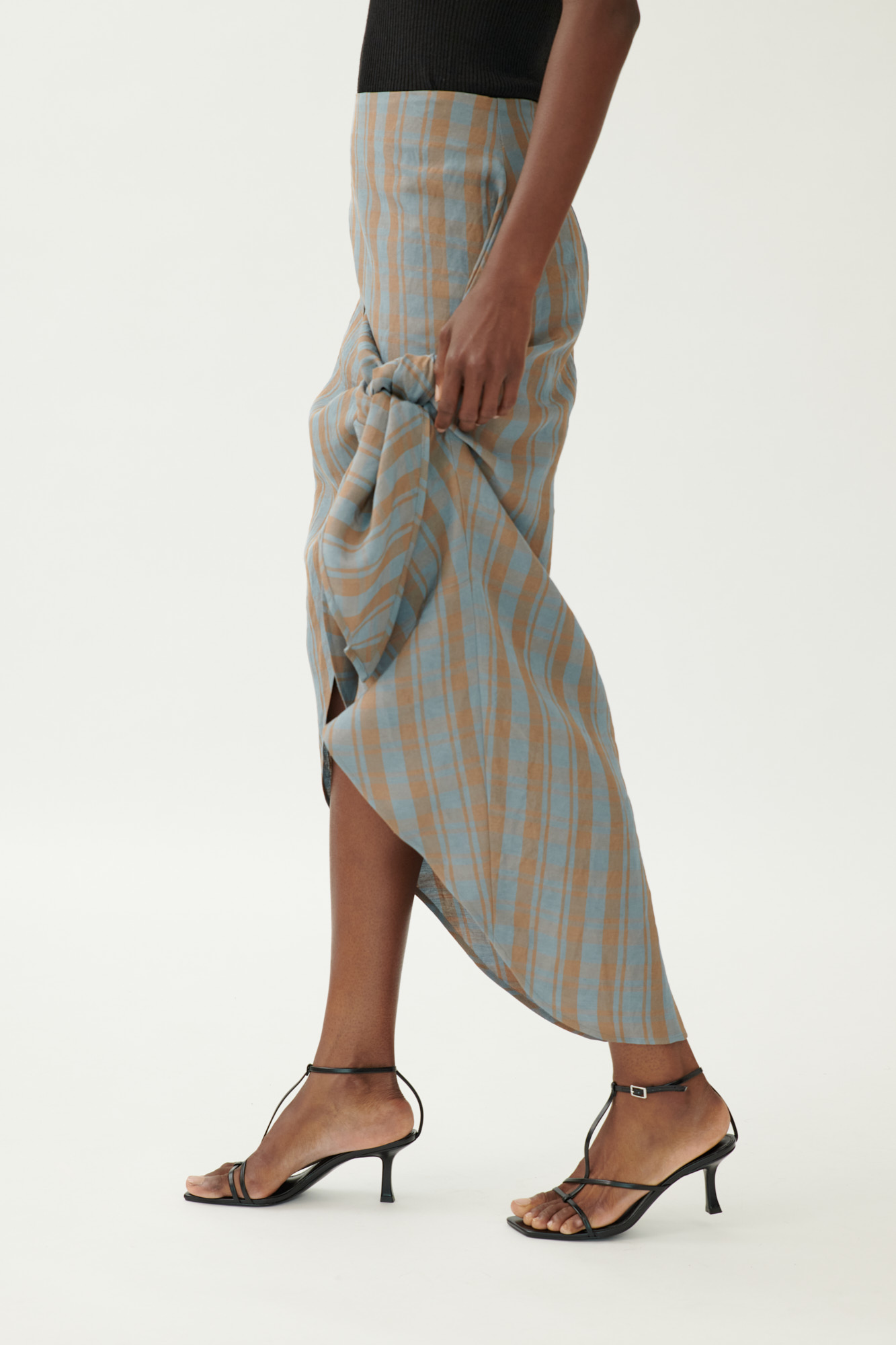 Geknoteter Rock aus gewaschenem Leinen-Viskose-Karo