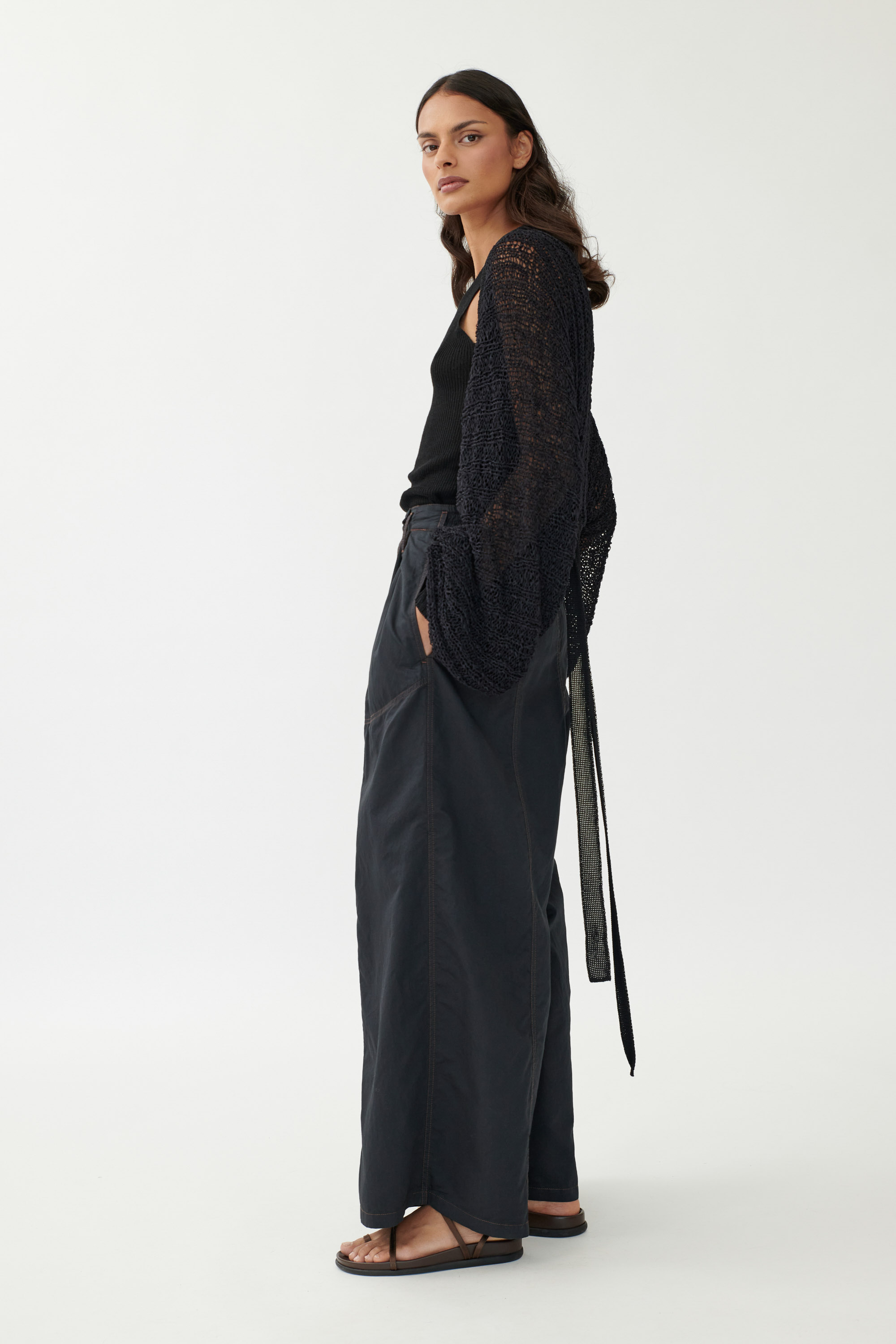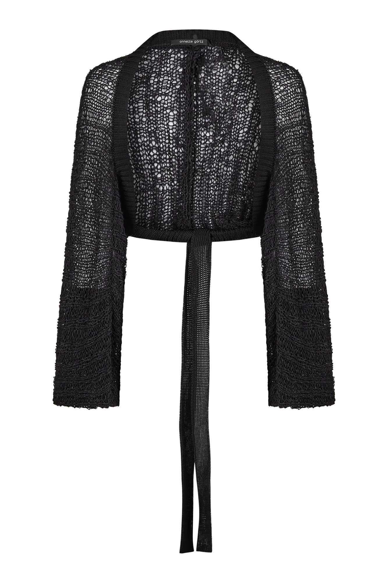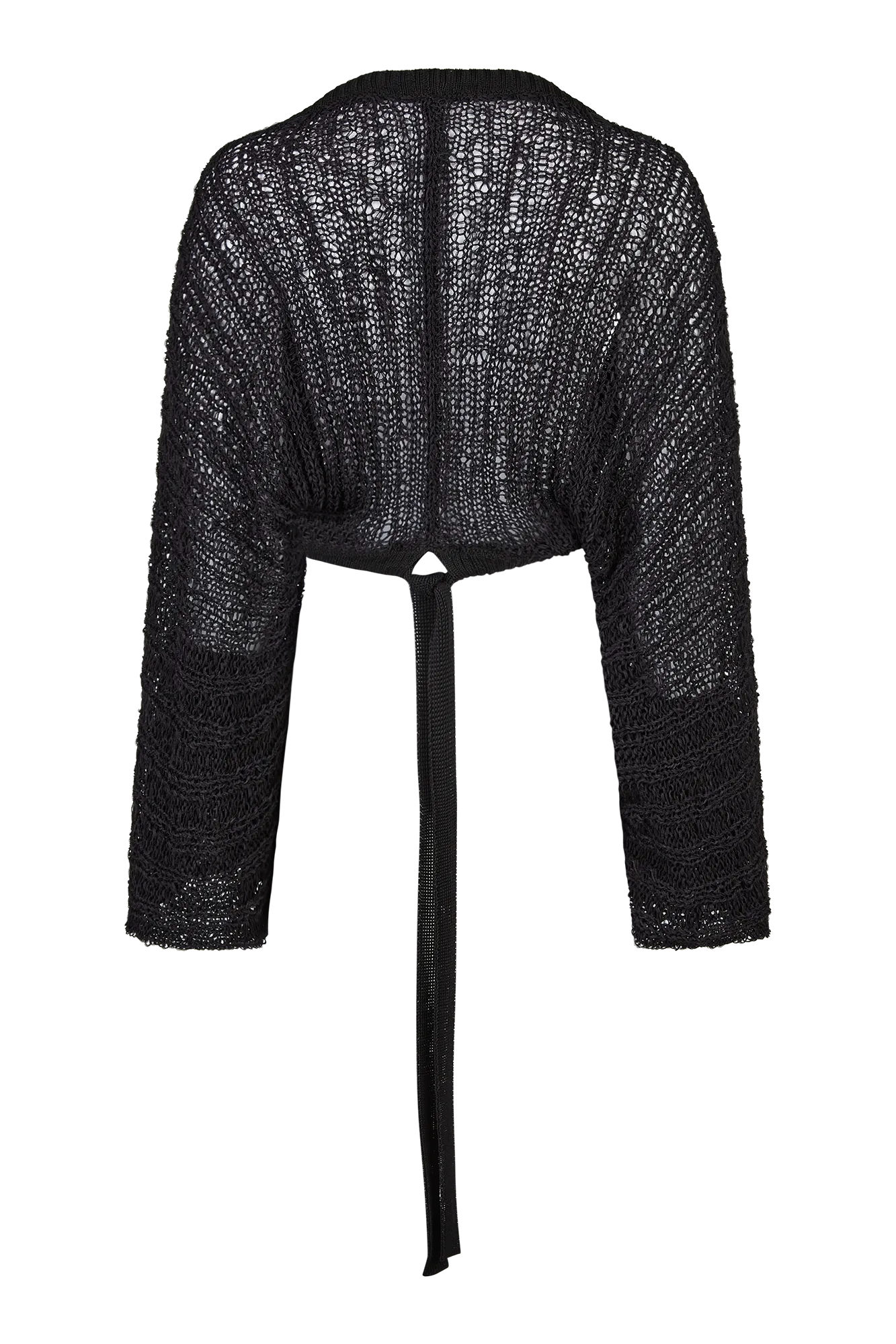 Kurzer Bolero aus feiner Seide mit Puffärmeln und verstellbarem Bindeband. Locker in Rippen gestrickt und mit eingezogenen Strickbändern gearbeitet, die im Rücken geknotet werden können. Die Bindung kann je nach Styling locker oder eng erfolgen. Die Ärmel sind leicht gerafft und schließen mit einem schmalen Rippensaum ab.