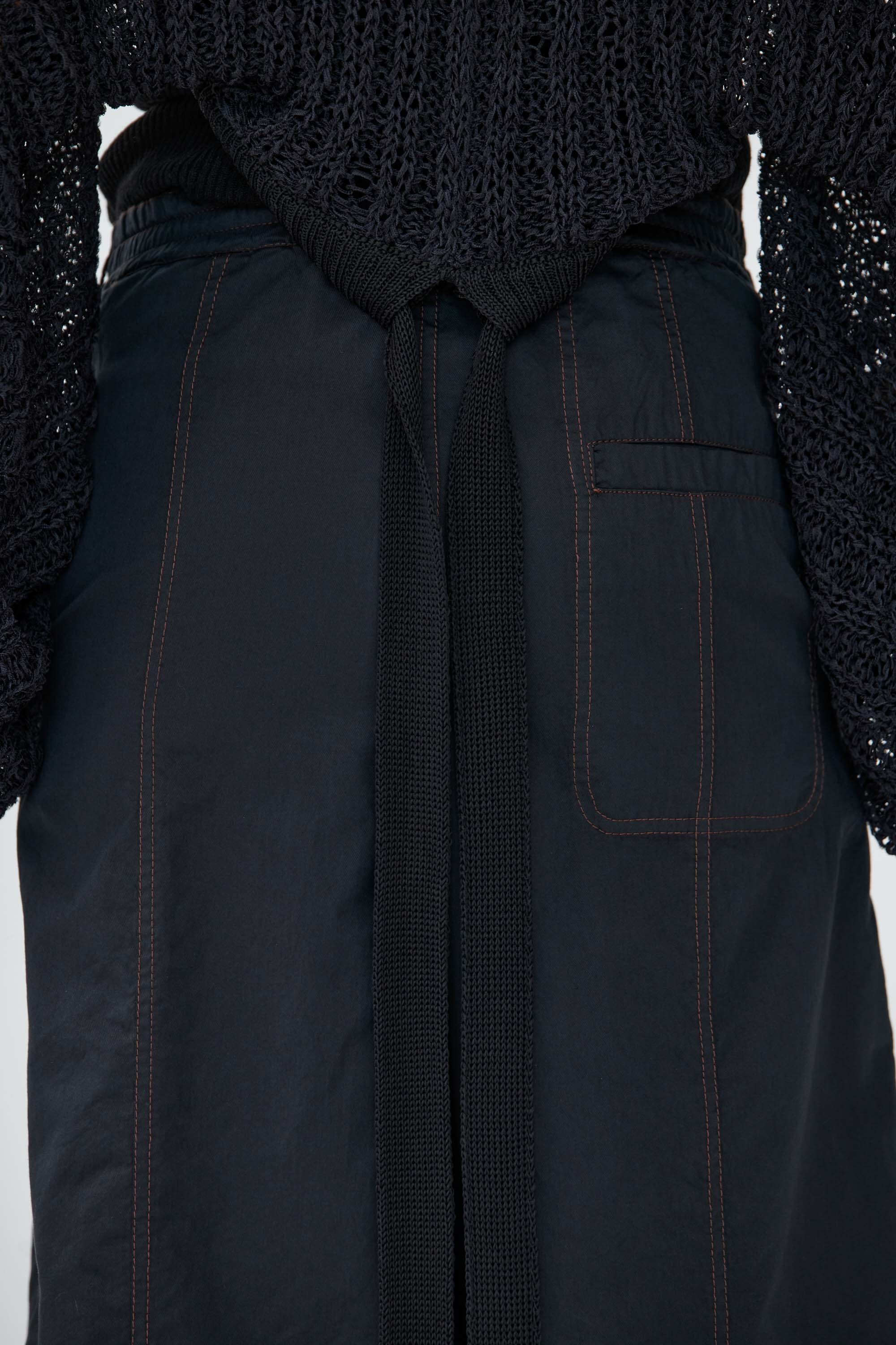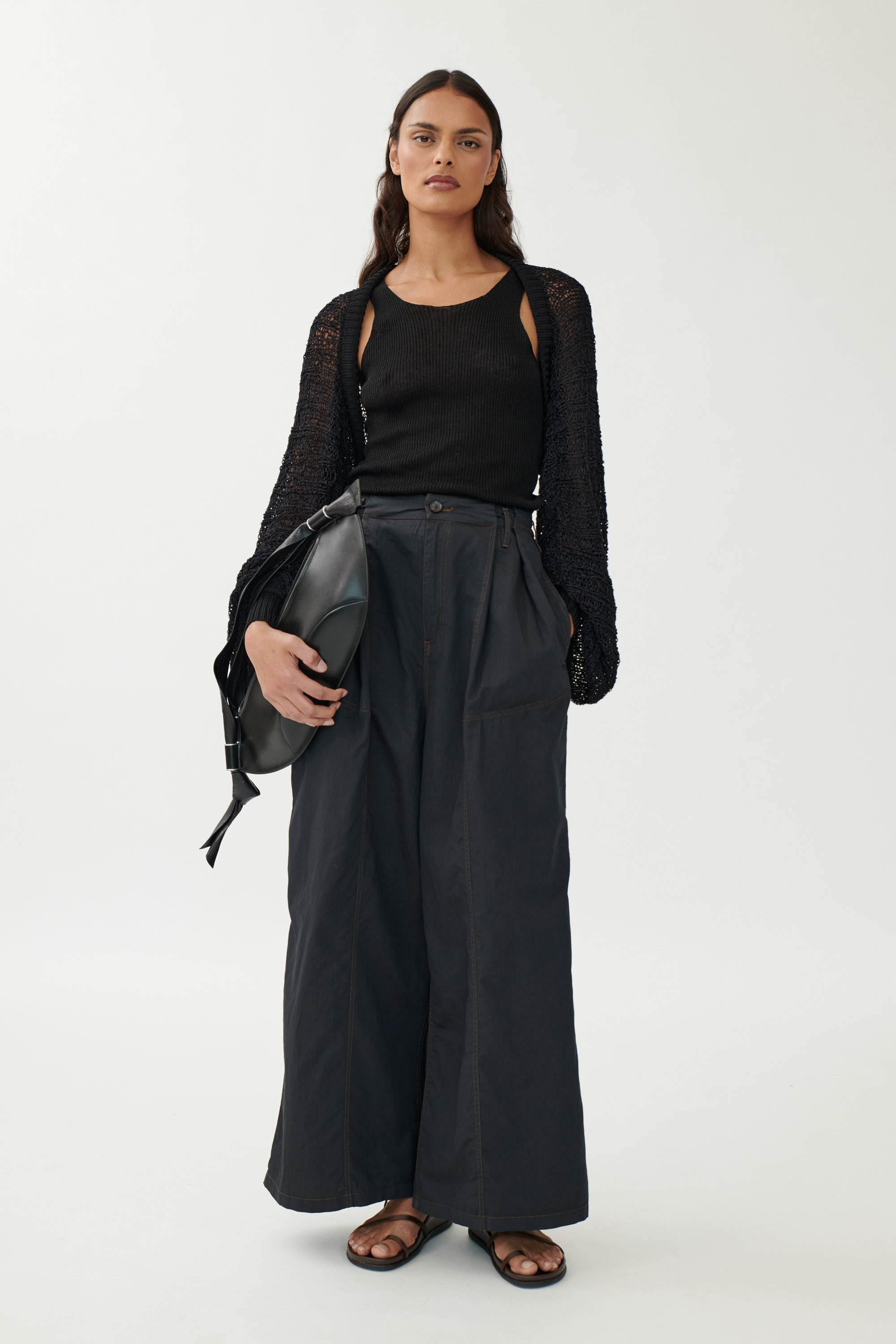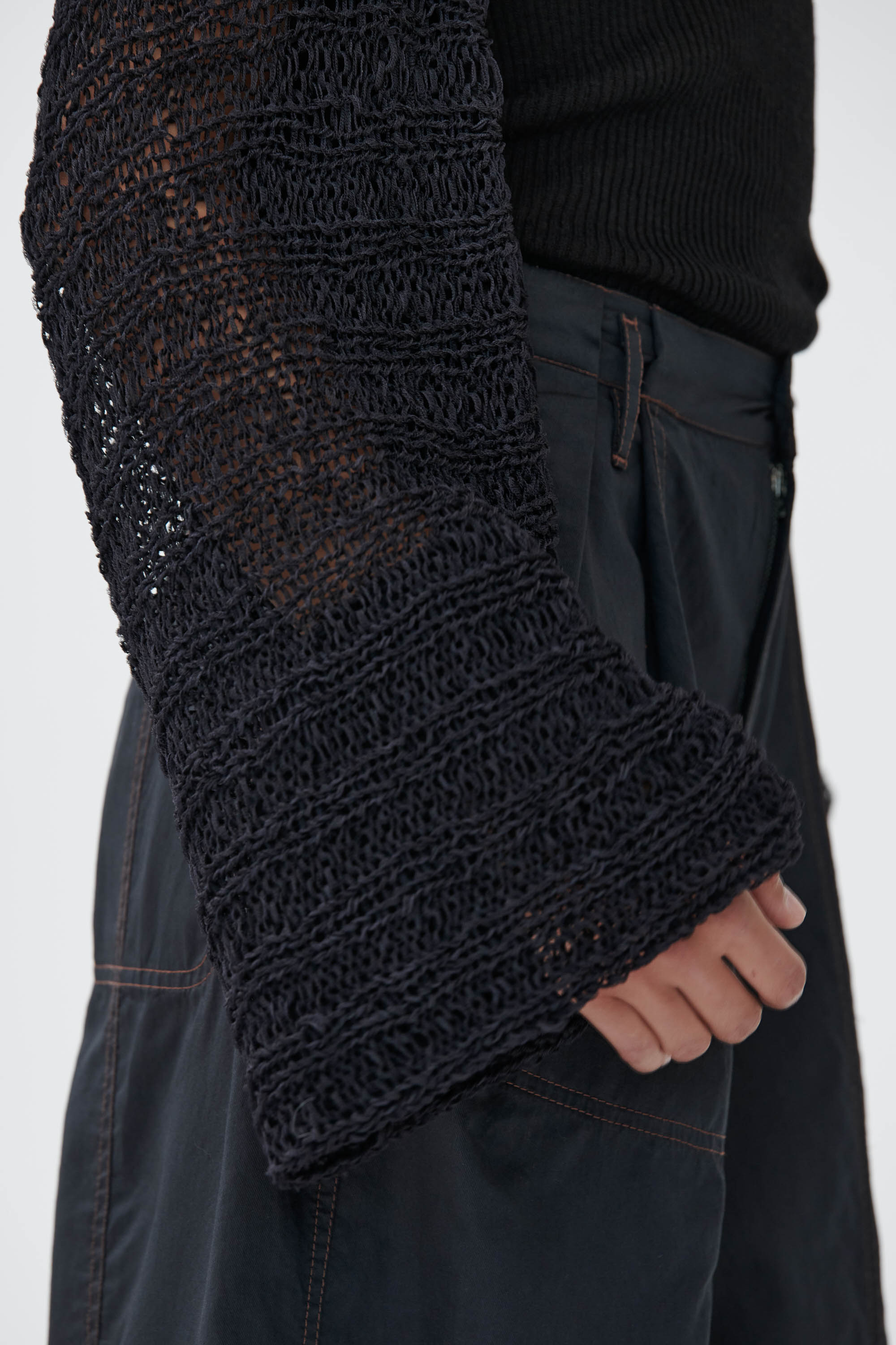Kurzer Bolero aus feiner Seide mit Puffärmeln und verstellbarem Bindeband. Locker in Rippen gestrickt und mit eingezogenen Strickbändern gearbeitet, die im Rücken geknotet werden können. Die Bindung kann je nach Styling locker oder eng erfolgen. Die Ärmel sind leicht gerafft und schließen mit einem schmalen Rippensaum ab.