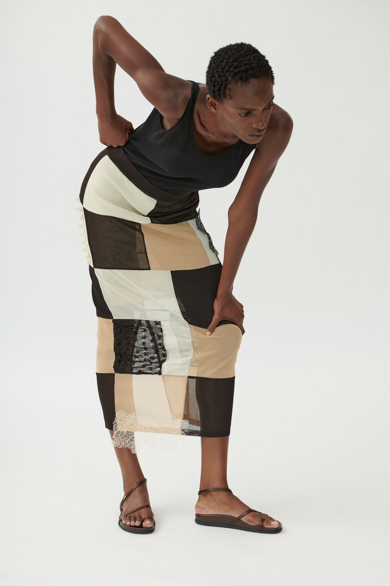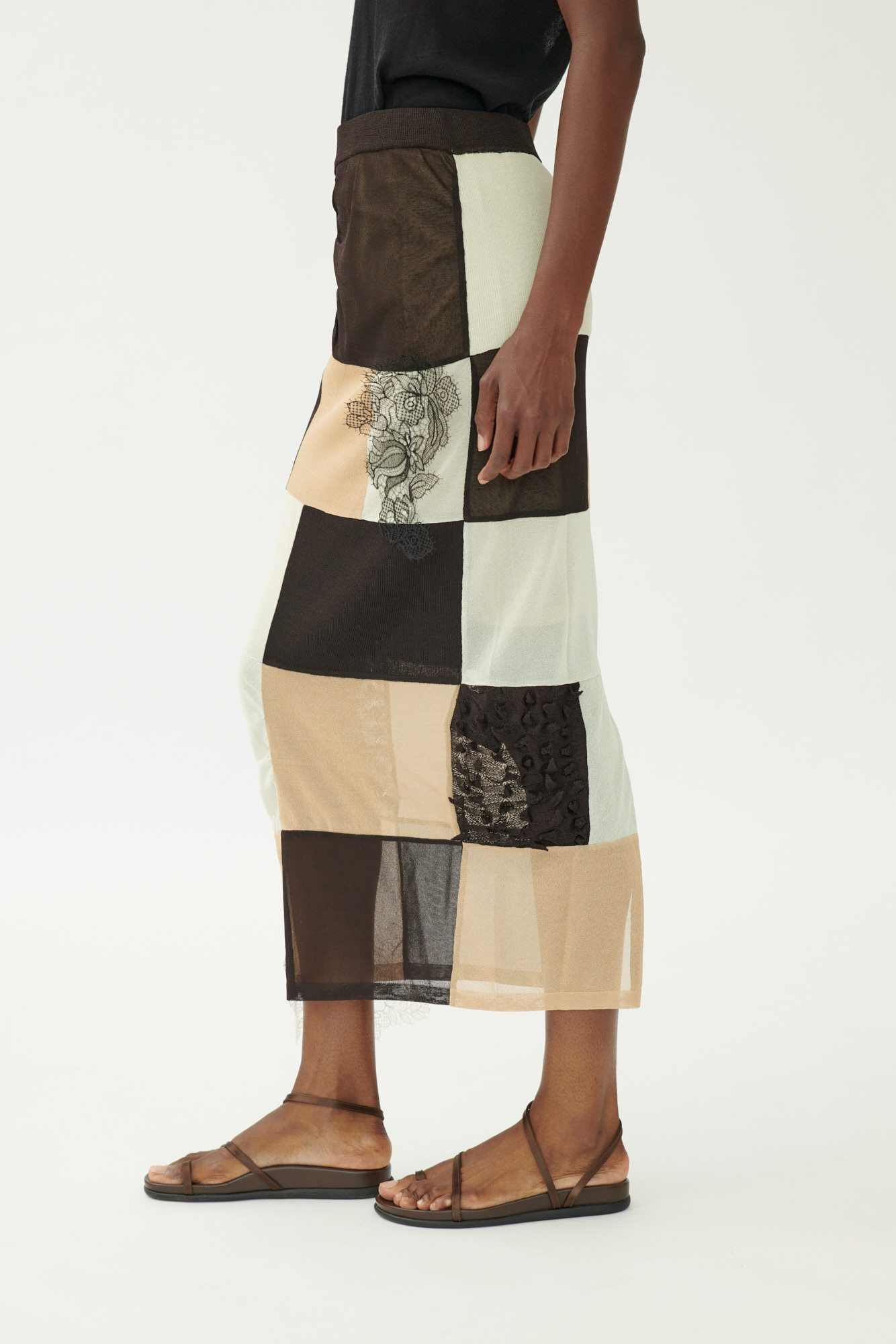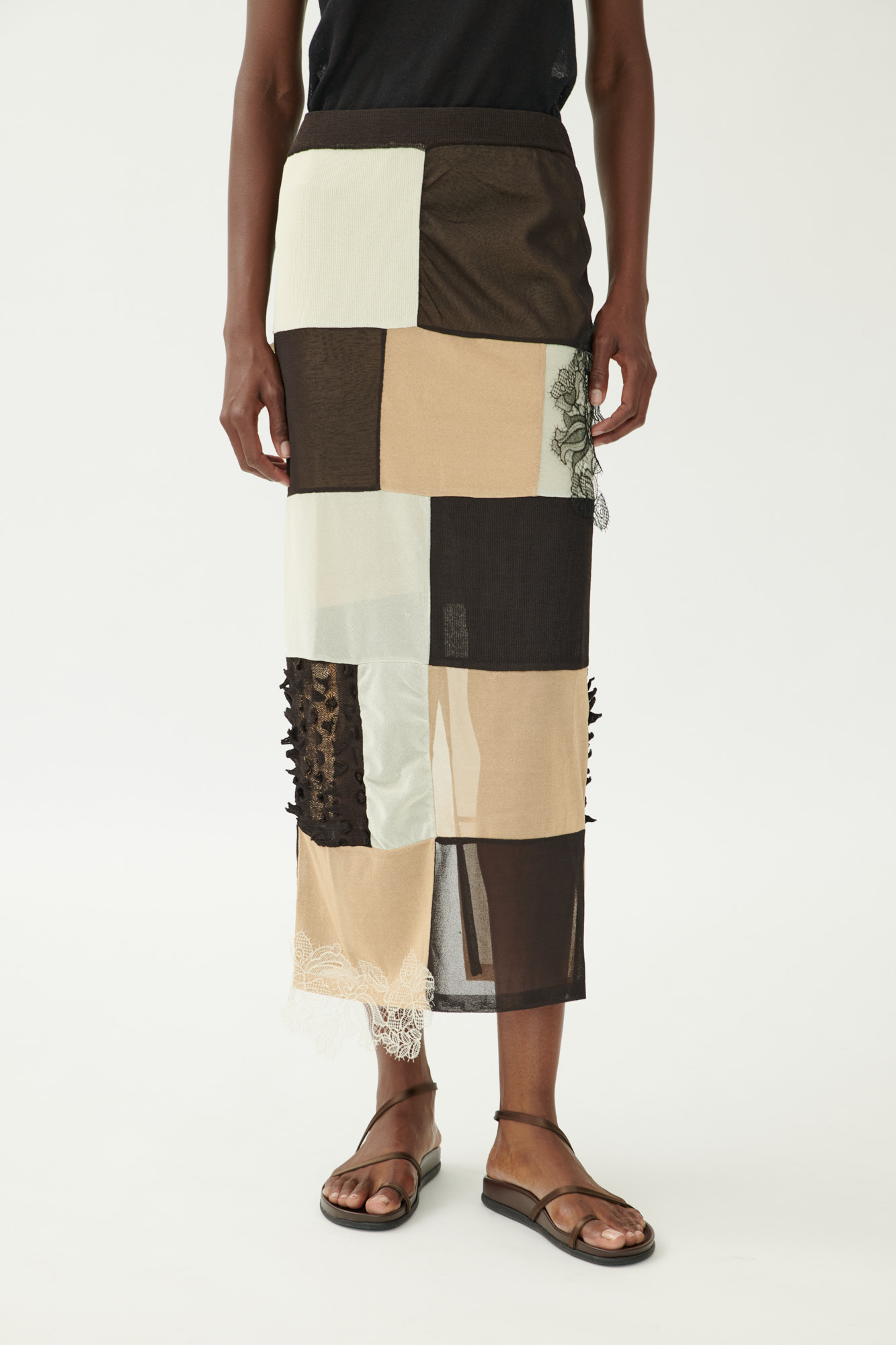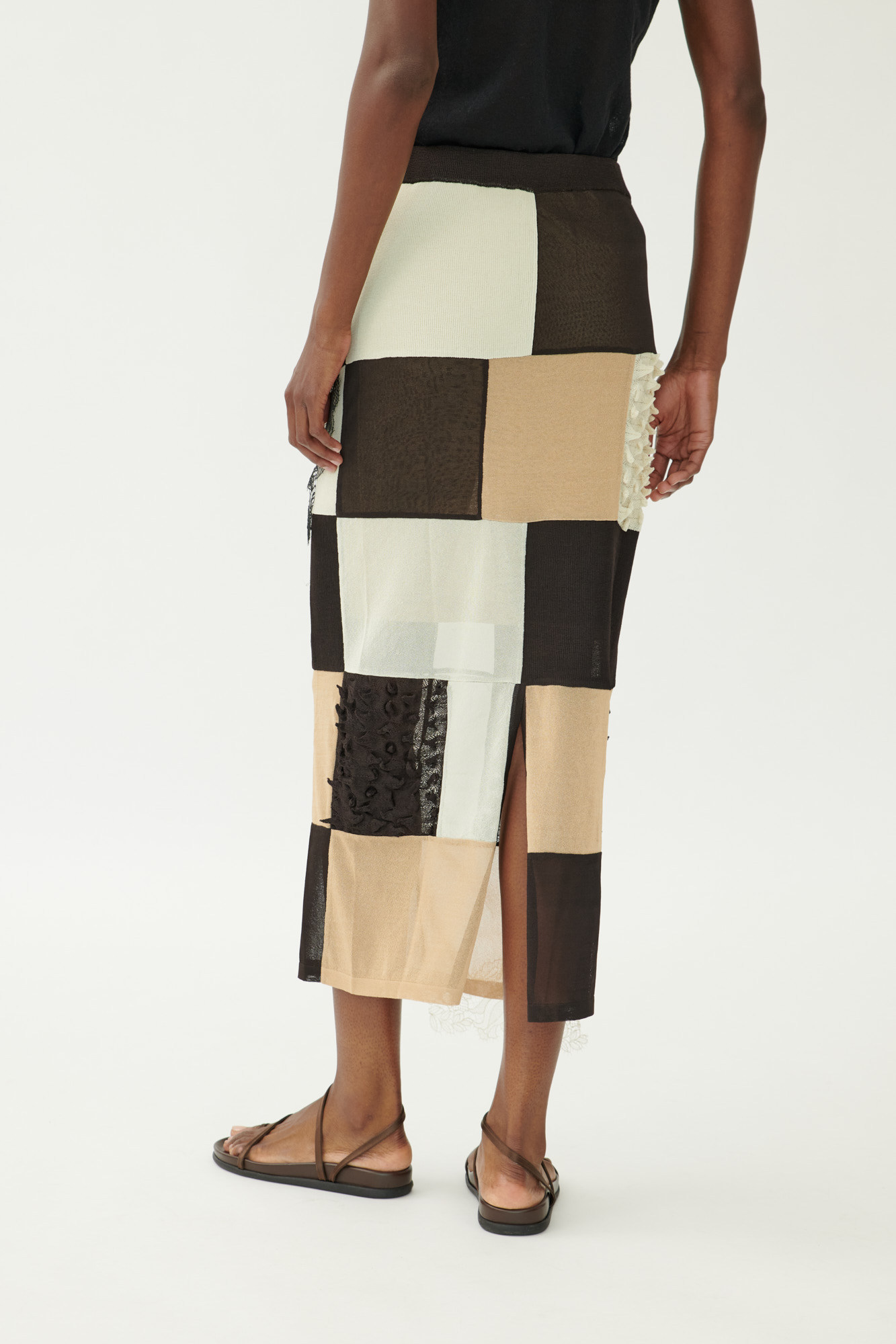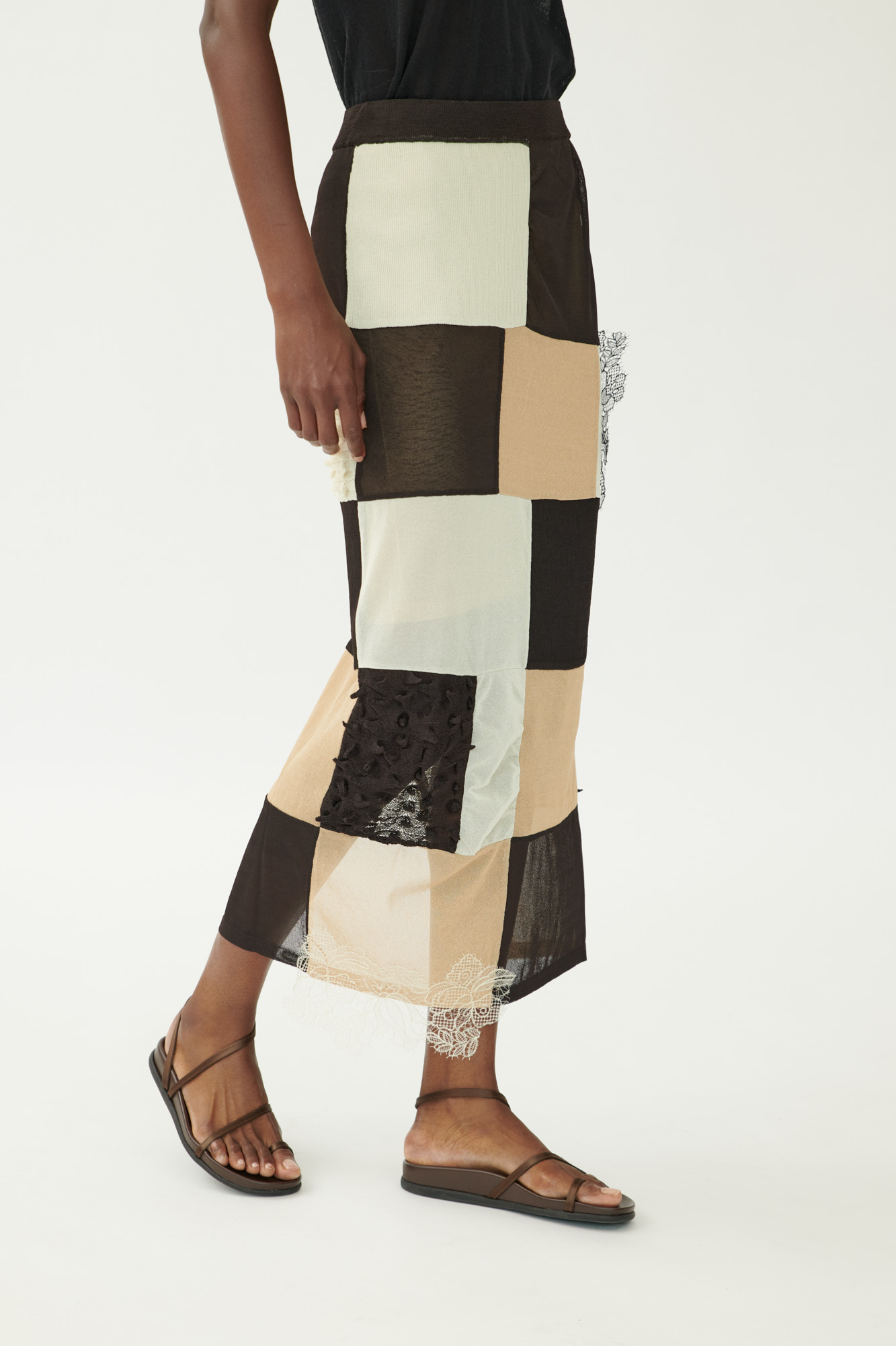 Ein grafischer Look mit weicher Silhouette: Dieser lange Rock kombiniert verschiedene, teils plastische Strickmuster zu einer modernen Patchwork-Optik. Der Schnitt ist an der Hüfte schmal und läuft gerade nach unten aus. Ein seitlicher Schlitz sorgt für Bewegungsfreiheit, während zarte Spitzendetails dem Design eine feminine Note verleihen.