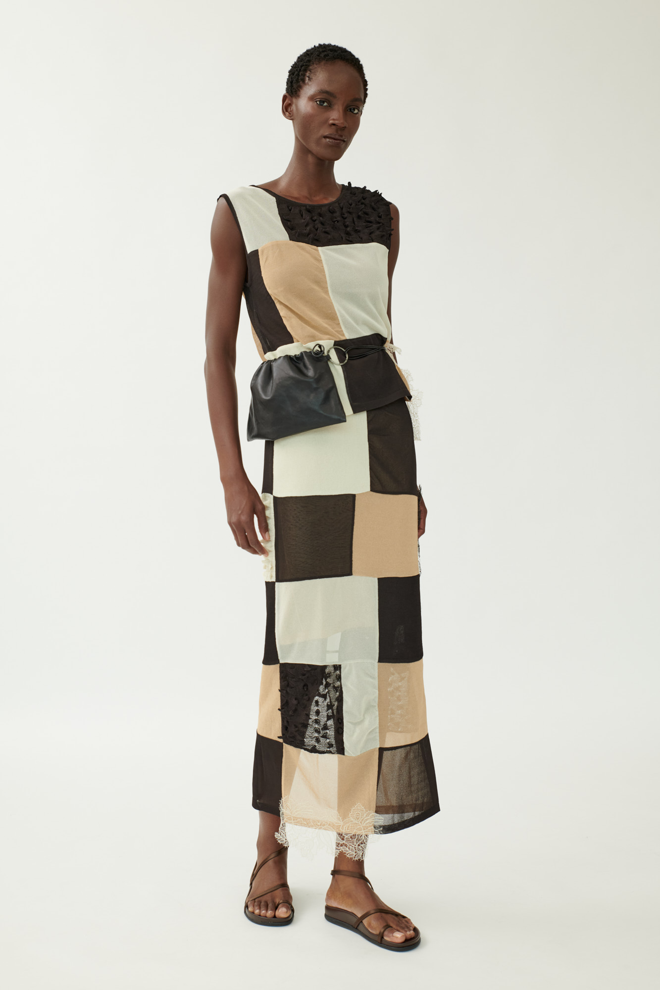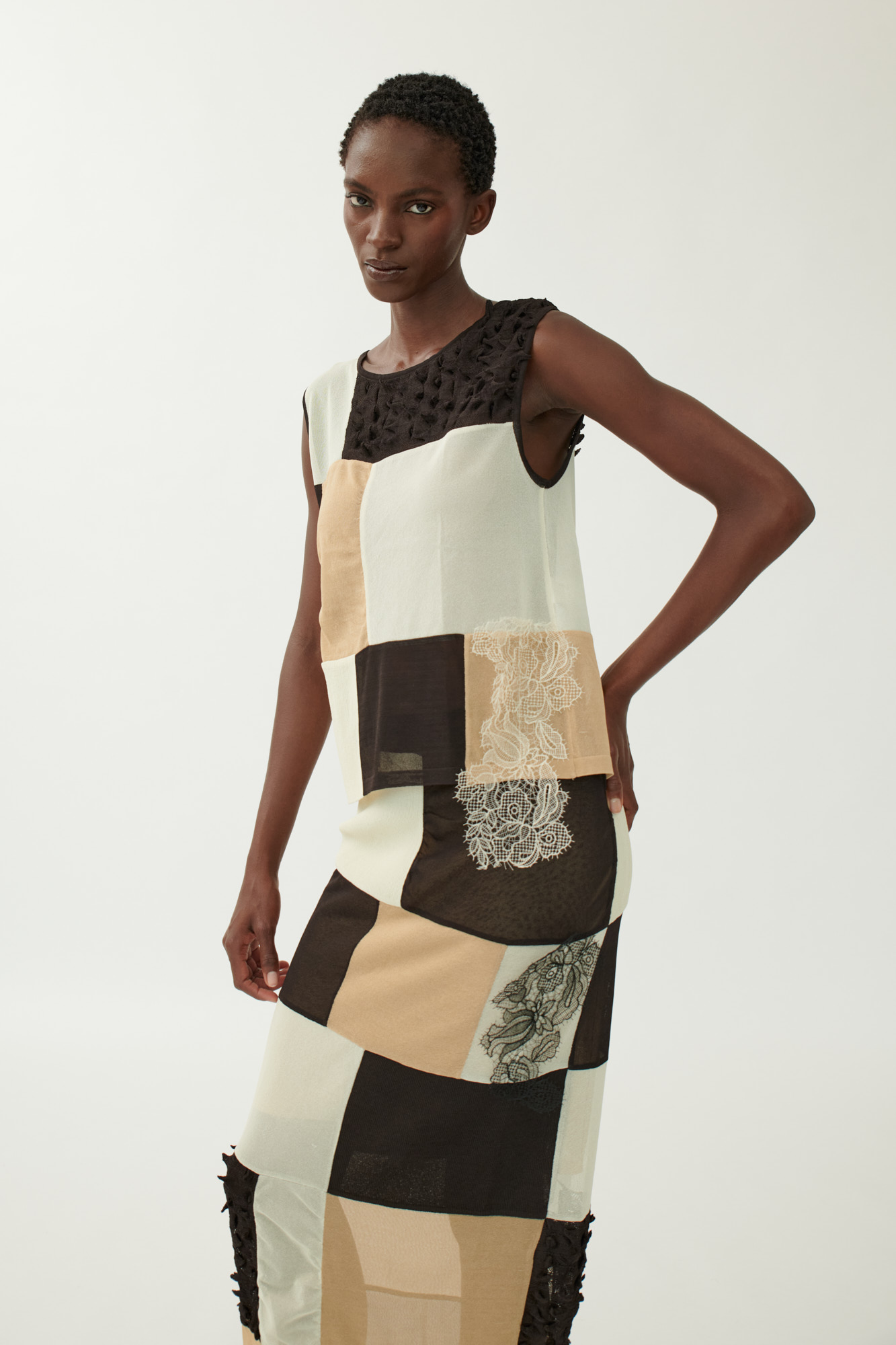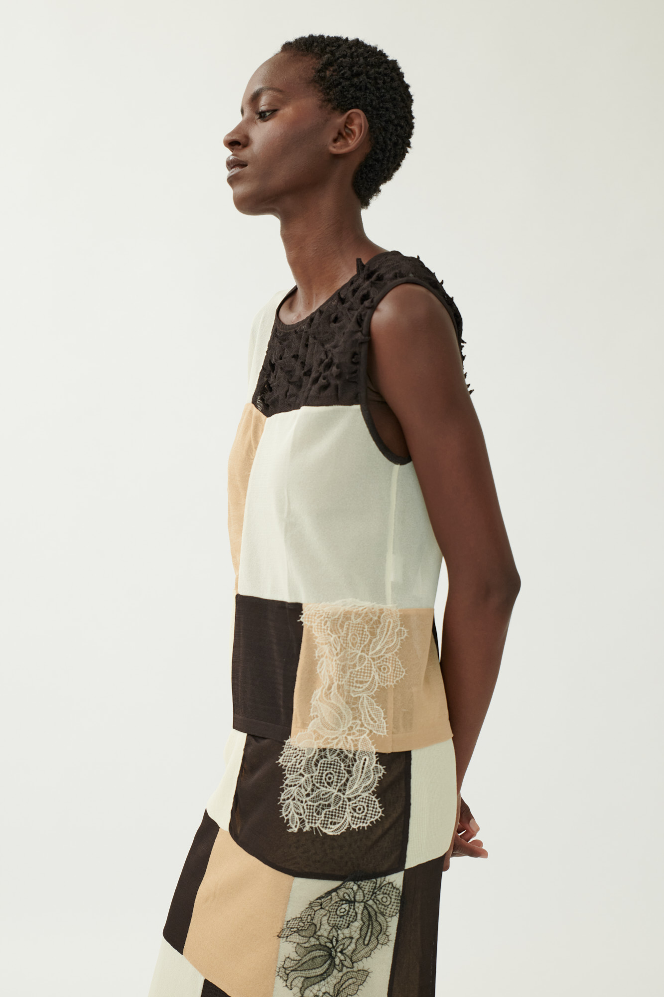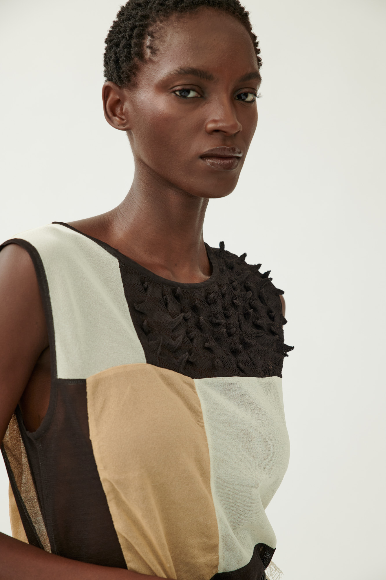 Ein Spiel aus Struktur und Transparenz: Dieses ärmellose Top kombiniert verschiedene, teils dreidimensionale Strickmuster zu einem grafischen Patchwork-Design. Breite Schultern und ein gerader, kurzer Schnitt verleihen dem Look Klarheit, während zarte Spitzendetails einen femininen Kontrast setzen.