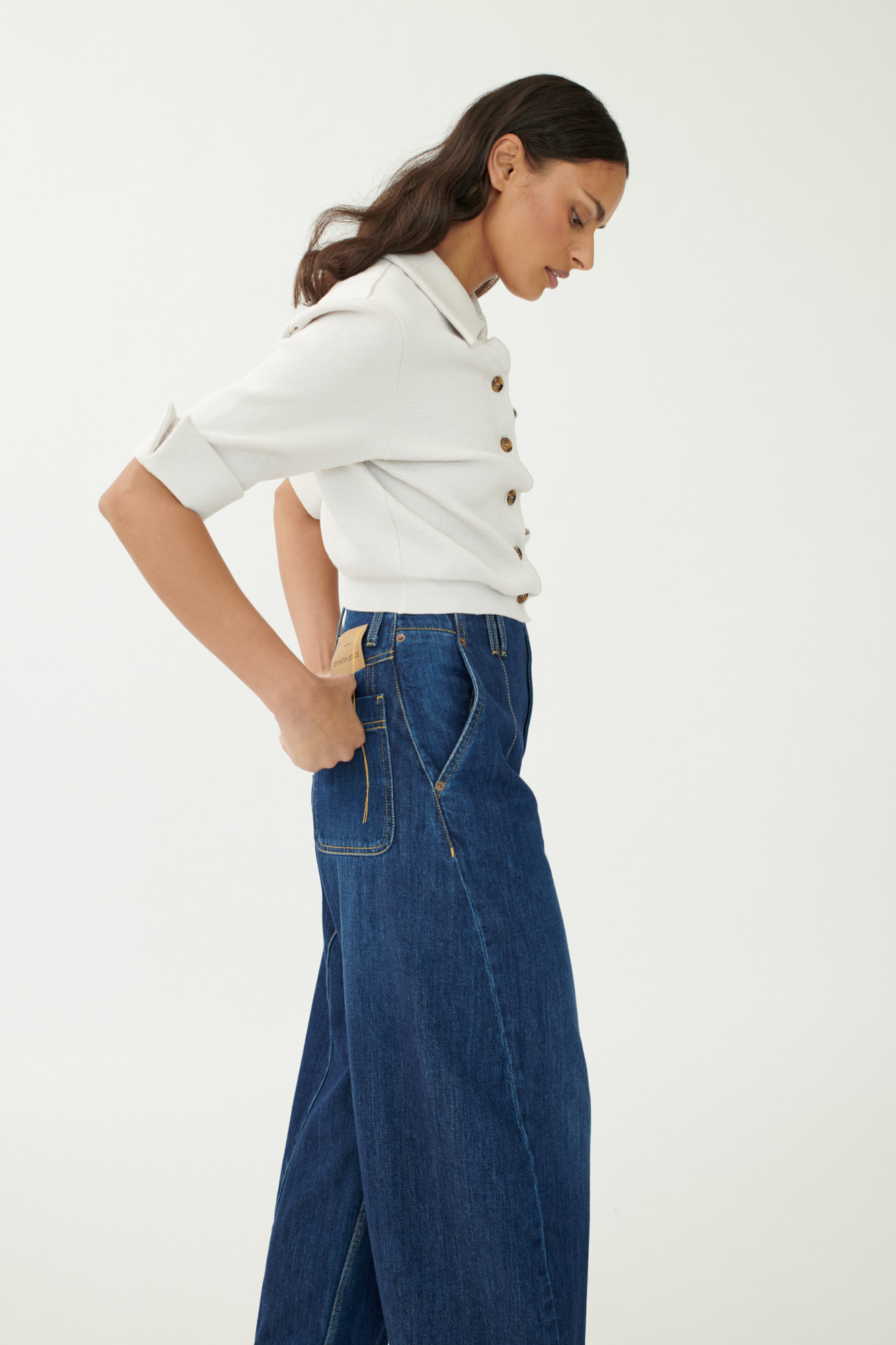 • Asymmetrische Knopfleiste mit Hornknöpfen und Metallakzent